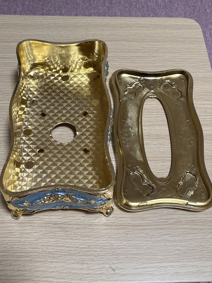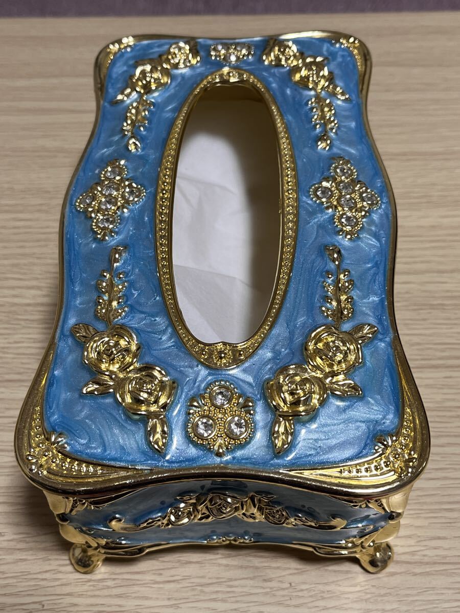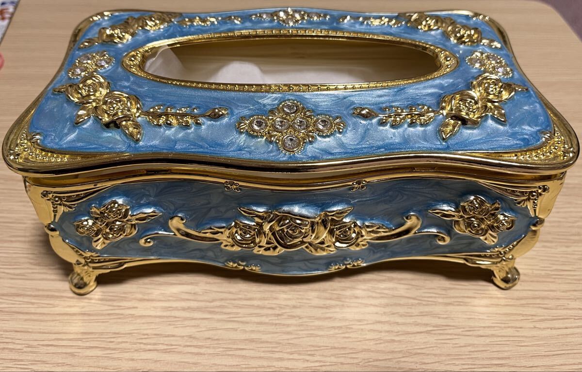 豪華な装飾が施された、エレガントなティッシュボックスです。ティッシュペーパーはイメージですが、箱から取り出して収納可能なサイズ感です。| 出价者 | 信用 | 价格 | 时间 |
