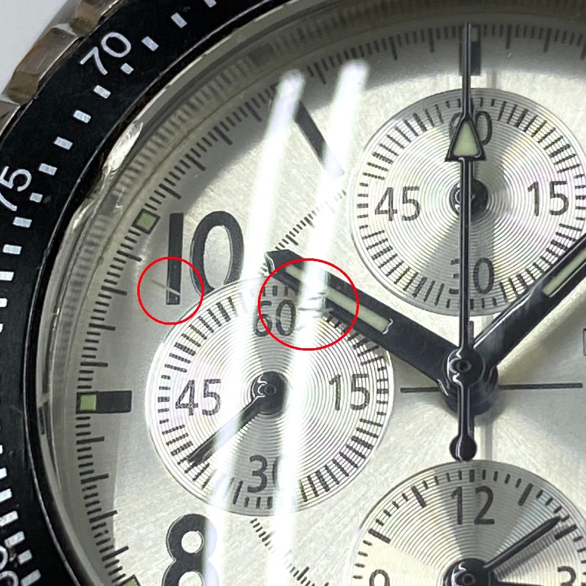 ・部分的な傷 【文字盤】 ・全体的な薄らくすみ 【ベゼル/ケース】 ・全体的な目立つ擦れや傷、打痕、裏蓋中心部に目立つくすみ、溝や隙間/内側に目立つくすみ汚れ 【リューズ/プッシュボタン】 ・表面に擦れや傷、溝や内側/周りにくすみ汚れ |