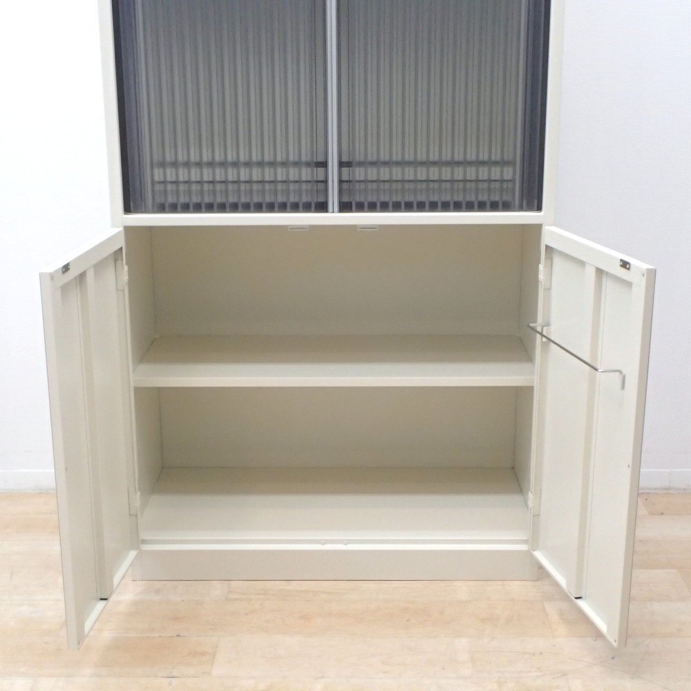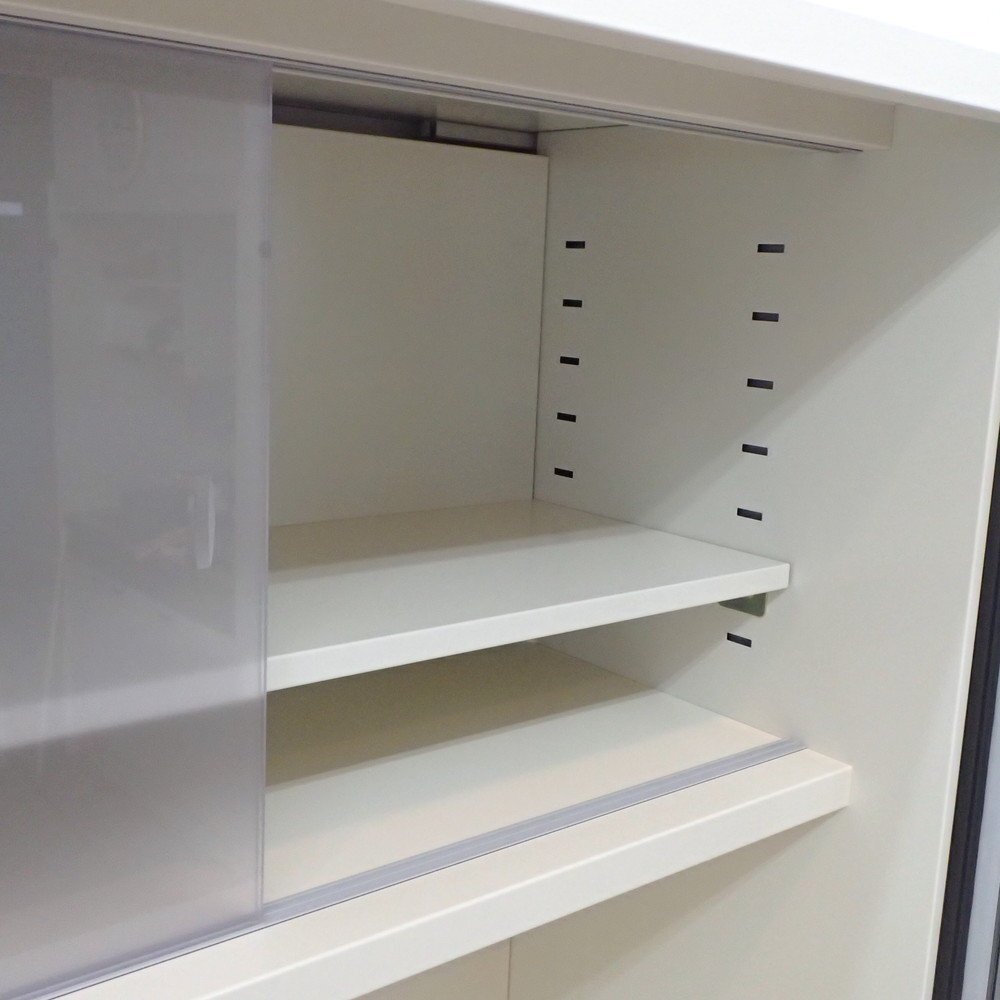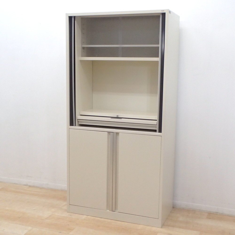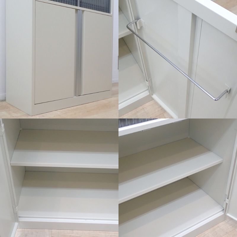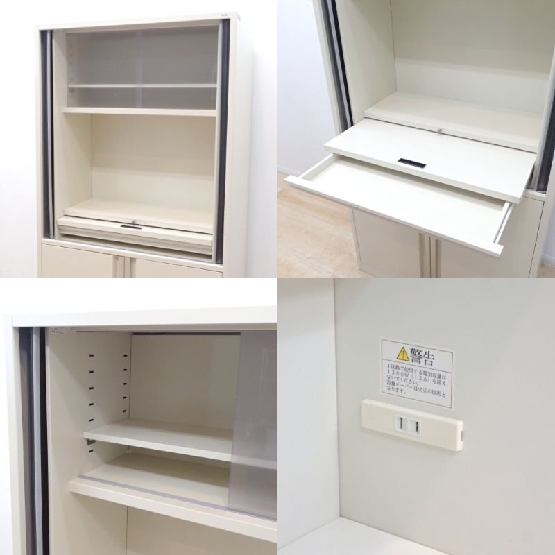 プラス ビジネスキッチンシリーズのキャビネットが入荷いたしました。 食器等の収納場所がわかりやすいスモークカラーのシャッター扉タイプです。 上段には引き戸付きの中段棚と引き出し付きの可動棚。 可動棚には固定できるストッパーがあり、作業中に閉まってしまう心配がありません。 コンセント差し口も常備なので、炊飯器や電気ポットなどもすぐに設置可能です。 収納部が細かく分かれていて仕分けがしやすいハイタイプの収納家具。 給湯室などにぜひご活用ください。 |