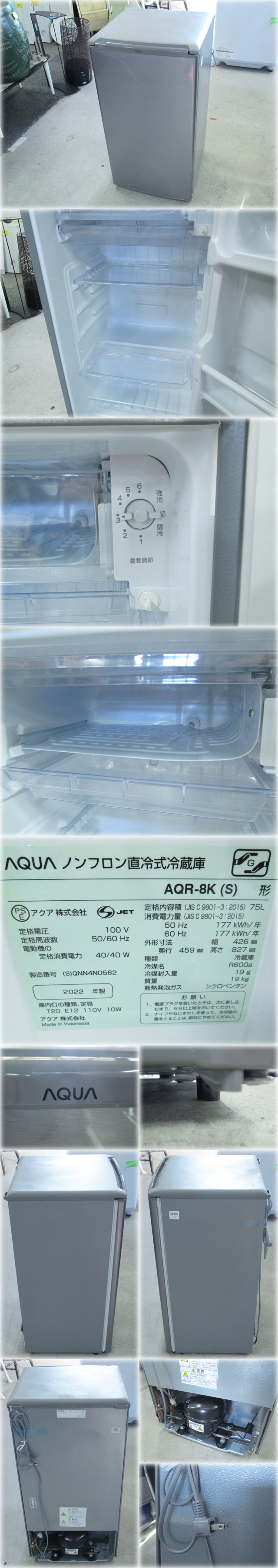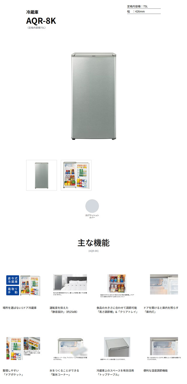 アクア 1ドア冷蔵庫 AQR-8K(S) を出品いたします。 ■特徴■ 場所を選ばない1ドア冷蔵庫 運転音を抑えた 「静音設計」(約25dB) 約25dBの静音設計だから、 暮らしの空間に置いても邪魔になりません。 食品の大きさに合わせて調節可能 「高さ調節棚」 & 「クリアトレイ」 食品の大きさに合わせて変えられる「高さ調節棚」。 クリアだから庫内が見やすくお手入れカンタン! ドアを開けると庫内を照らす 「庫内灯」 整理しやすい 「ドアポケット」 扉には4段のドアポケット。 卵や小物棚があり、充実の収納機能 氷をつくることができる 「製氷コーナー」 ※製氷コーナーでは、アイスクリームや冷凍食品の貯蔵はできません。 冷蔵庫上のスペースを有効活用 「トップテーブル」 食器やキッチン小物を置くことができます。 便利な温度調節機能 急いで氷を作りたいときや、 季節によって温度を調整することができます。 ■仕様■