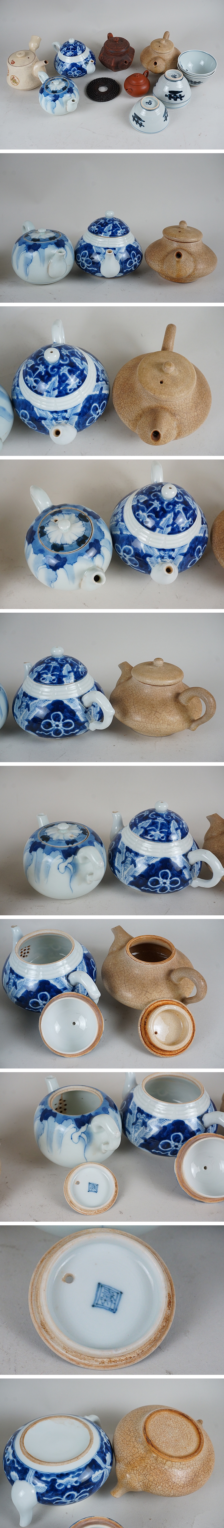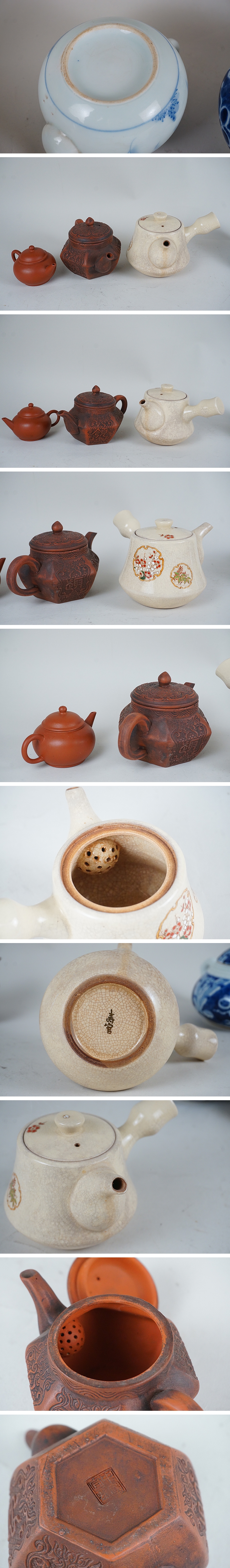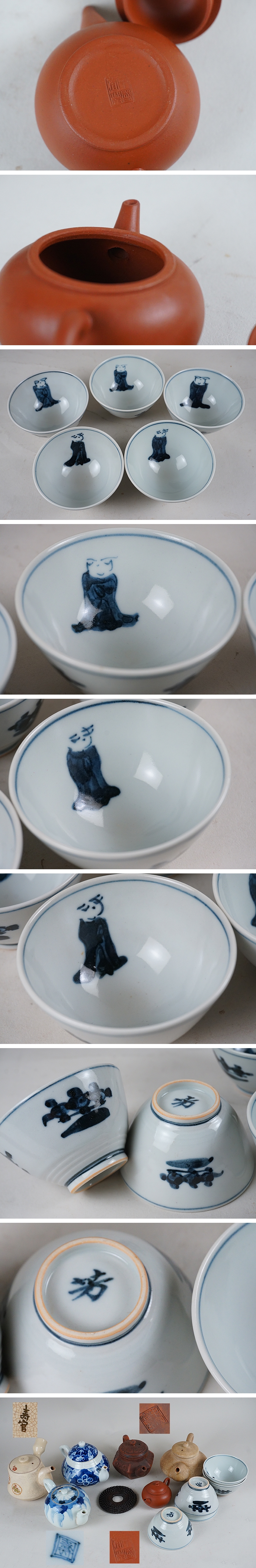 | 古い急須、薩摩焼、伊万里焼、中国朱泥等です。 使用感、小さな擦れなどあります。大きな傷はありません。 画像ご参考の上ご入札ください。 薩摩寿官 重さ263g 高さ縁まで7.3cm 胴幅9.3cm 伊万里急須 重さ199g 高さ縁まで6.1cm 奥行き12.6cm 幅8.5cm 茶碗湯呑 重さ88g 高さ4.9cm 口径8.3cm | |||