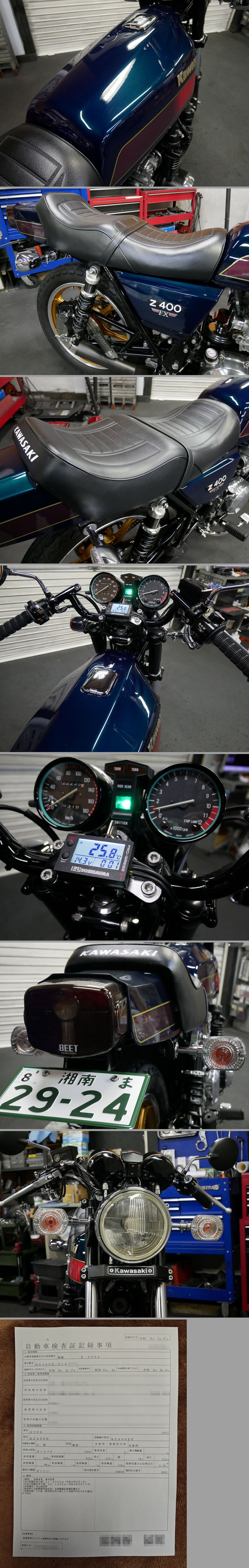 中古車の為小傷 経年変化 消耗 カスタム変更箇所等はご理解ご了承下さい。 エンジンセルにて始動OK!!レスポンスの良い吹き上がりでアイドリングも安定しています!動画をご覧ください。☆☆☆ 当方で分解清掃、磨きをした非常に綺麗なkawasaki Z400FX カスタムです。お探しの方にお勧め出来る一台です。只今室内保管中!! 是非大事に乗って頂ける方にお譲りいたします。 走行確認済み(車両のコンディションを保つ為走行いたしますので、若干走行距離が伸びる場合もございます)ご了承くださいませ。 名義変更後直ぐにお乗り頂けます。是非ツーリングや街乗りをお楽しみください。 当方の見落としや説明不足も有りますので、疑問や不安な点がある場合や 細部を気にされる方は、オークション終了前に現車確認してください。 写真で見ると光の反射で傷に見えたりする場合も御座いますので気になる方はご質問下さい。 現車確認の際は、下記項目(①~⑤番)を記載の上当方のメールアドレスまでご連絡ください。 新規IDの方や評価が著しく悪い方で、ご購入を検討されている方は購入意思確認の為gensyakakunin1@gmail.comまで下記の項目を 記載の上ご連絡下さい。 ①タイトル ②お名前 ③ご住所 ④電話番号 ⑤ヤフー ID ご連絡のない場合は入札を取り消す事がありますので予めご了承下さい。 遠方で現車確認が不可能な方等は写真やご質問で判断して頂き必ずご納得の上、入札参加 落札をお願いします。 お気持ちの良いお取引を心がけていますので、慎重なご入札落札をお願いします。 車両の全てを文章でお伝えするのは難いため動画や写真を複数掲載しております kawasaki Z400FX 昭和55年国内物の動画をご覧ください。 https://youtu.be/AgZf7ca6QCo 是非写真をご覧になってくださいませ♪