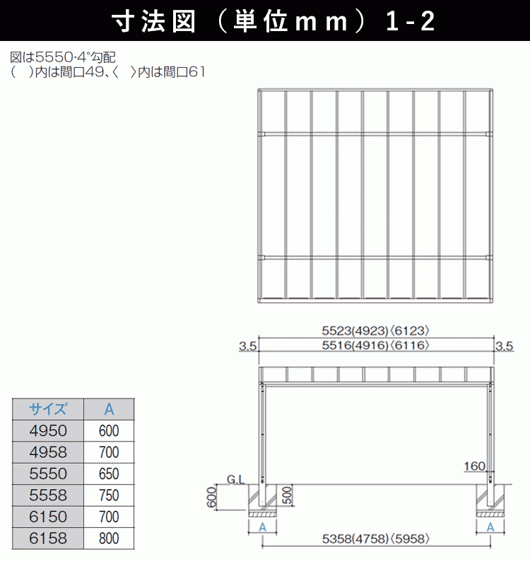 ※奥行、高さH1寸法は4°勾配の場合です。8°勾配の場合は寸法図画像2-2をご確認下さい。 ▽ 仕様