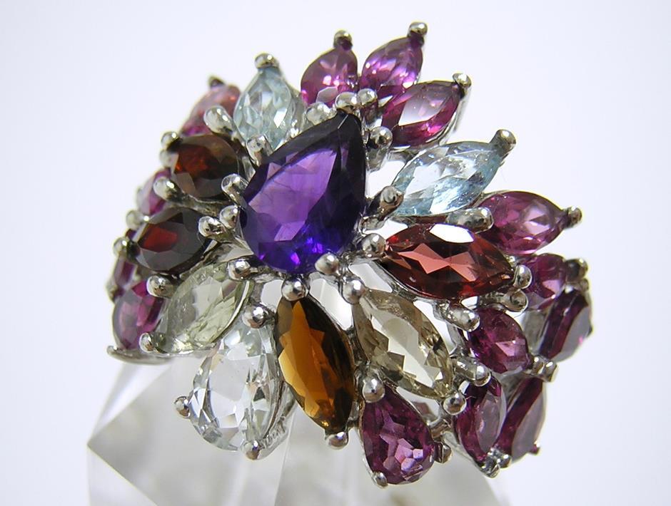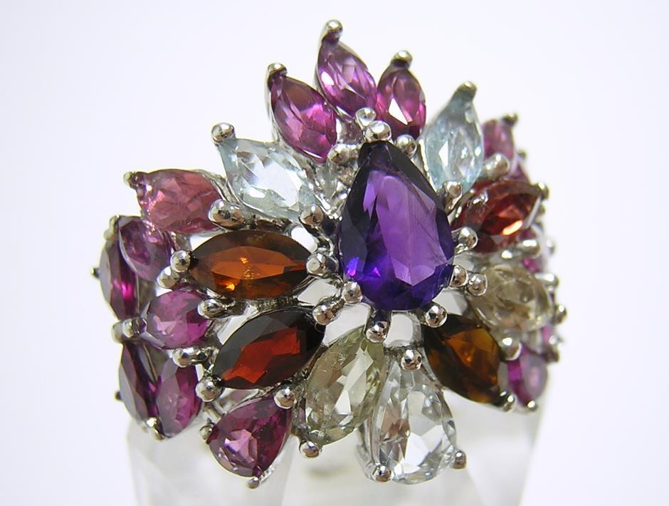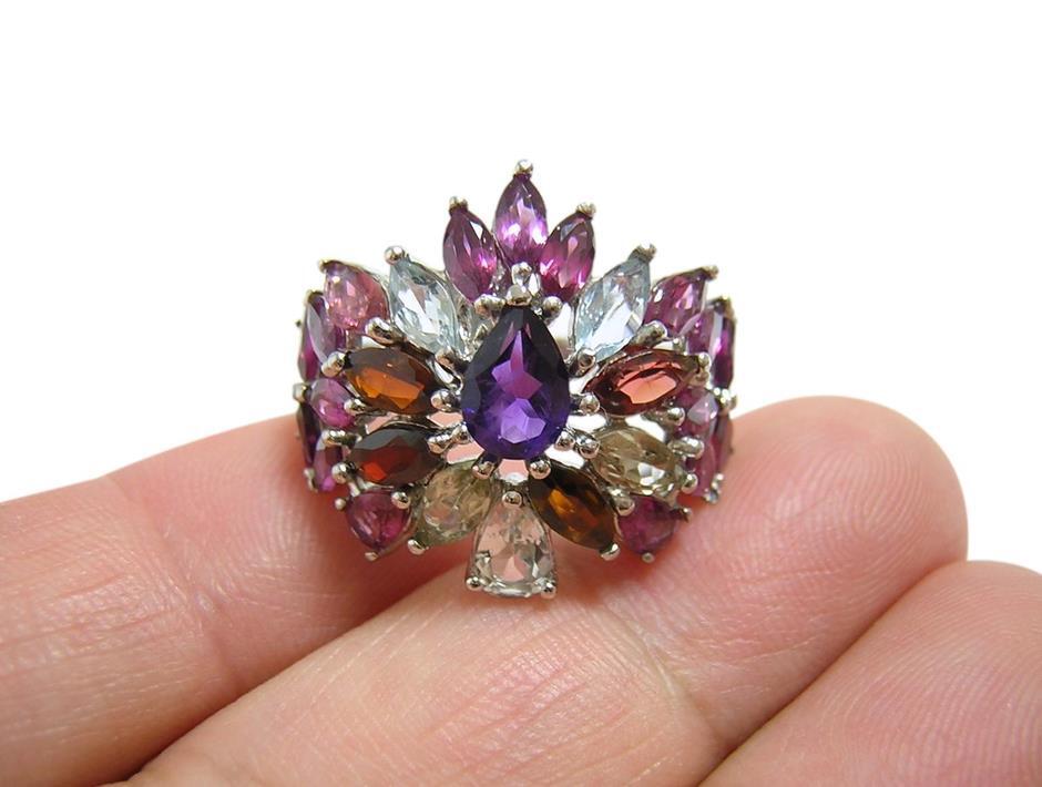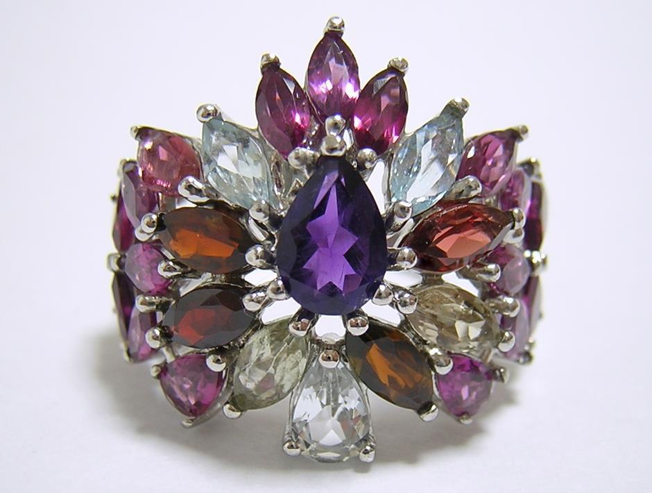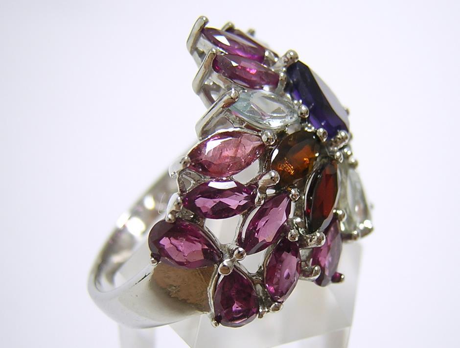 天然アメジストとアクアマリン、ロードライトガーネットとマルチカラートルマリンを使用したデザインリングです。