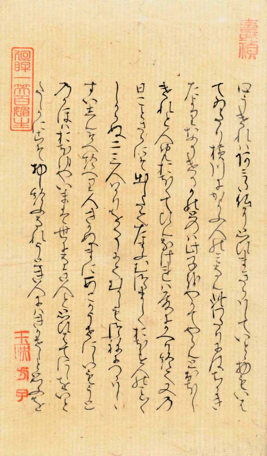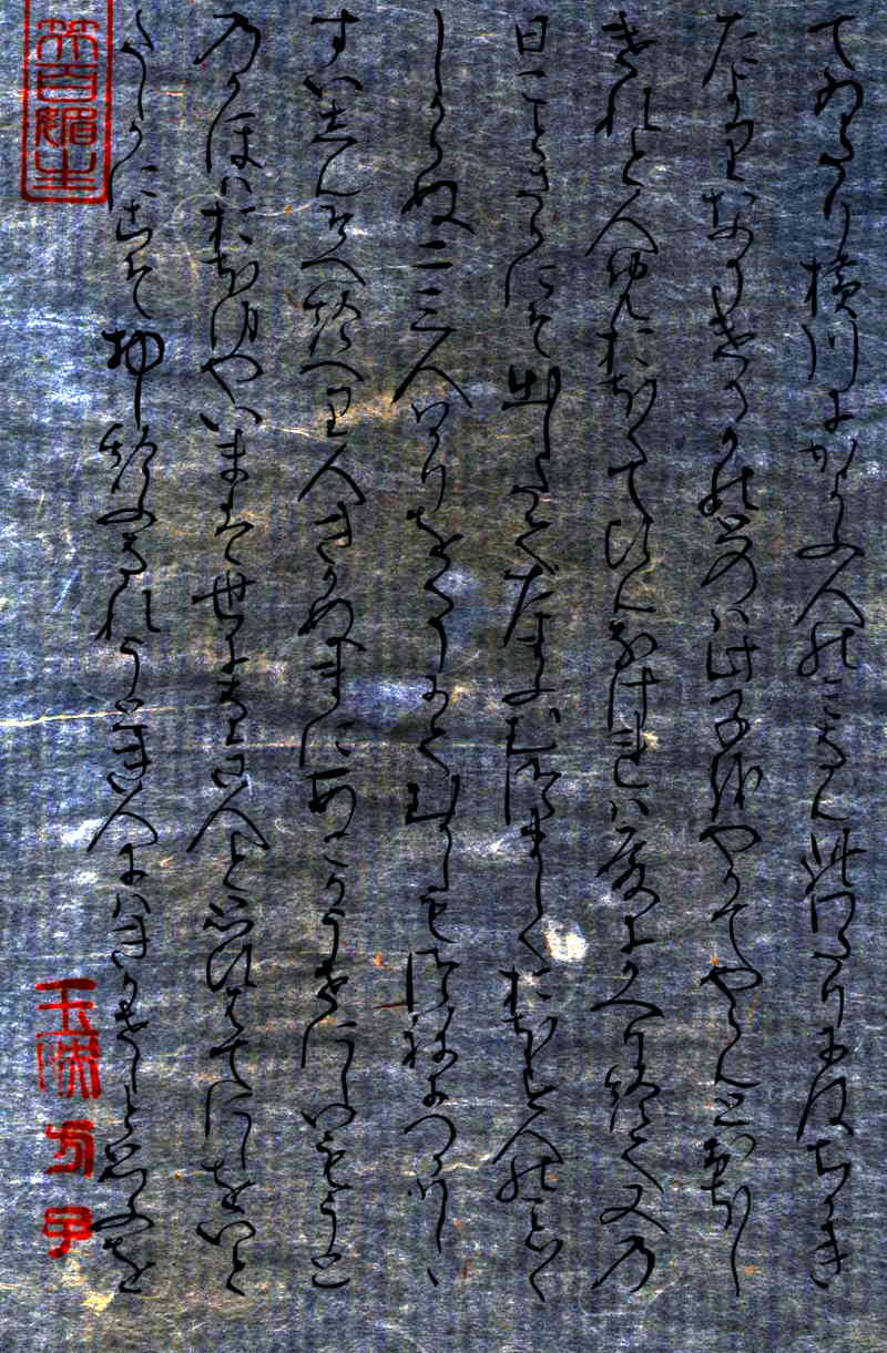 という漢文の篆書印が押捺されている。言葉の意味は、「狐という仮の物が本物のように人を惑わせる。しかし、本当の美女(楊貴妃)が人を魅了するのは、往々にしてそれを超える」のです。この漢詩は白楽天の漢詩の有名な一節です。紫式部が「夢浮橋」を書くに際し、「白楽天・漢詩集」の漢詩を熟読したうえで「源氏物語」の「夢浮橋の巻」を書いていることがわかります。この原詩の言葉の引用は、「夢浮橋の巻」に用いられていることで広く知られている。紫式部がこの原詩に親しんでいたことがわかる。