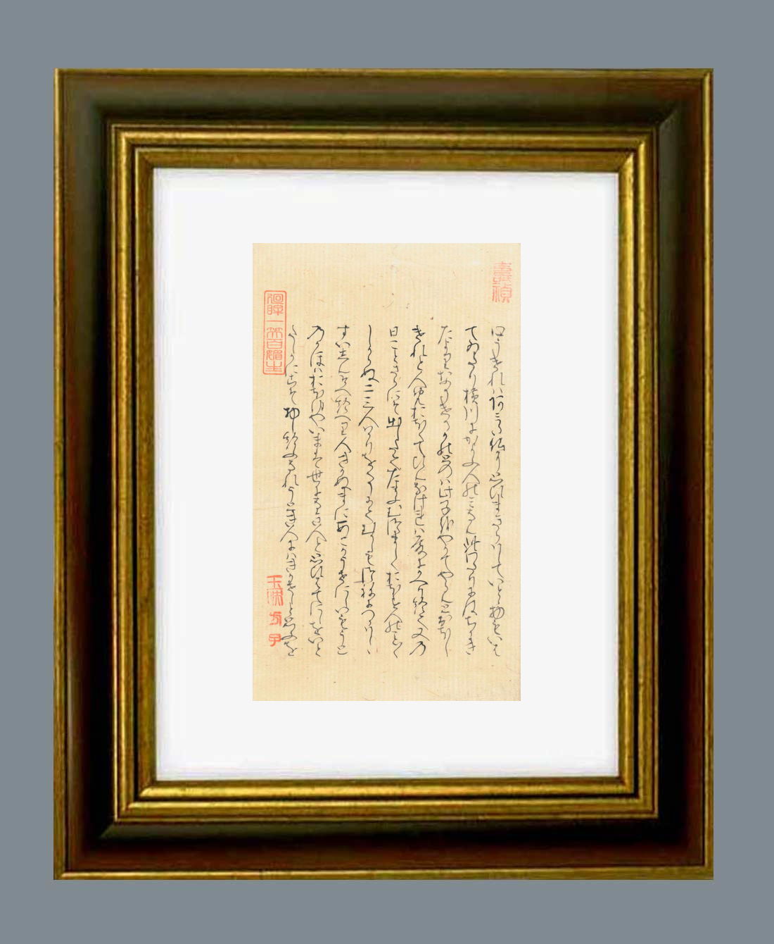 「源氏物語」自筆の大きさ タテ21.8センチ ヨコ12.8センチ。額縁の大きさは タテ37.0センチ ヨコ28.0センチです。額縁は新品です。 |