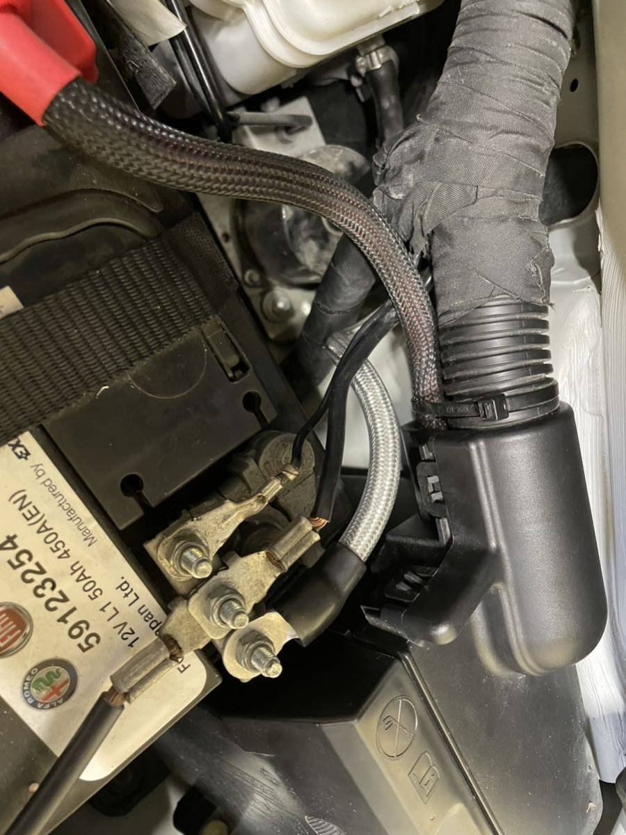 アバルト500 595用アースです。ノーマルのアースポイントの奥のボルトで長さを合わせて制作しています。ノーマルのケーブルがあまりに貧弱ですのでリフレッシュついでに追加してみてはいかがでしょうか?