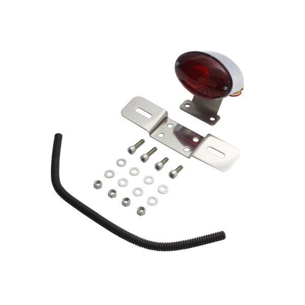 | ●商品種別:ライト、レンズ > ブレーキ、テール ■ユニバーサルミニキャッツアイテールランプキット。(ナンバープレートベース付き) ■12V18/5Wバルブ付 ■ステー:ステンレス製 ※取付にはフェンダーへの穴あけ加工が必要です。 |