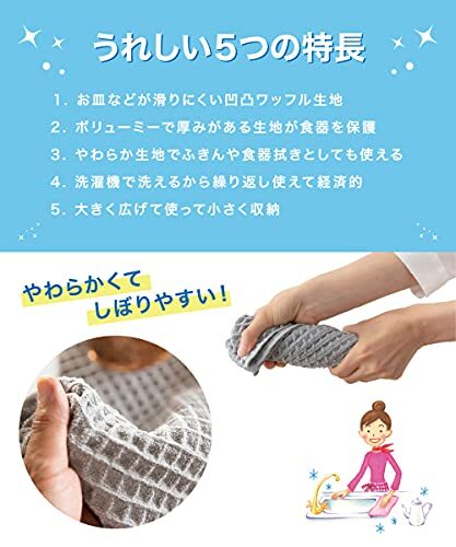 「テイジン あっちこっち水切りマット 40cm×45cm グレー 食器 乾燥用マット 日本製 吸水 速乾 抗菌 ミクロスター」▼4995296604604▼(商品説明)単品・グレー 45×50cm 24/723MTNGR・・Size:45×50cmUnitCount:1・テイジンのあっちこっちシリーズより、水切りマットを発売しました。優れた吸水性、速乾性はそのままで、安心な抗菌機能もついております。・あっちこっちシリーズは水滴の拭き跡が非常に残りにくく、二度拭きの手間を減らします。また、シンクにうっすら残る油膜もスカッと一度で落とします。・キッチンや調理スペースがひろびろ使える!必要な時にさっと広げるだけで、水切りカゴや珪藻土マットなどを置いていた場所がスッキリします。・お皿などが滑りにくい凹凸ワッフル生地。ボリューミーで厚みがある生地が食器を保護。やわらか生地でふきんや食器拭きとしても使えます。・テイジン独自の極細繊維ミクロスターを使用。水だけで汚れを落とせて食器、窓ふき、フローリングなど何度でも繰り返し使用可能。経済的でエコなふきんです。優れた吸水性と速乾性。安心な抗菌機能つき! お皿などが滑りにくい凹凸ワッフル生地。 ボリューミーで厚みがある生地が食器の水分を吸収します。 やわらか生地でふきんや食器拭きとしても使える。 洗濯機で洗えるから繰り返し使えて経済的。 大きく広げて使って小さく収納。 キッチンがひろびろ使える! 調理スペースがひろびろ! 必要な時にさっと広げるだけ。 水切りカゴや珪藻土マットなどを置いていた場所がスッキリ! 大きなお鍋とお皿が一緒に置ける! 鍋やフライパンなど大きめの調理器具を一緒に置けるサイズなので、 片付けも一度にできて楽ちん。クッション性のあるワッフル生地なのでお皿を保護します。 使い方いろいろ 水切りの他にも、食器拭きやテーブルふきんとして使える優れもの。 使わない時は小さくたたんで戸棚に収納できます。 すばやく吸水 表面にはテイジンのマイクロファイバー糸を使用。 極細繊維だからぐんぐん水を吸水。コップ1杯分(約300cc)の水をしっかり吸水! 速乾性に優れているため、洗濯しても乾きが早く、毎日使えます。 驚くほどの速乾性と抗菌加工 極毛繊維マイクロファイバーが水を素早く分散させ、 驚くほどの速乾性です。抗菌加工もしてある為、安心してお使いいただけます。