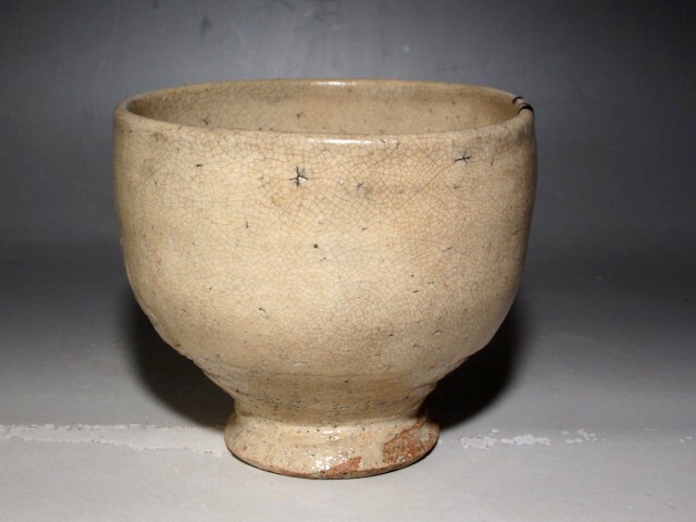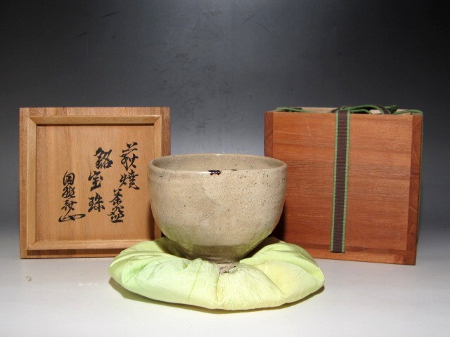 古萩茶碗「宝珠」です。 時代を感じる見事な出来栄えの貴重な作品です。 箱蓋裏に裏千家十三世円能斎の花押のある名品です。 サイズ 直径11.5cm/高さ9.5cm(多少の誤差はお許しください) 状態 直しが施されています。 骨董品という事をご勘案頂き、時代経過のスレや、小さな傷がある場合があるかもしれませんのでご承知置きください。 | |||