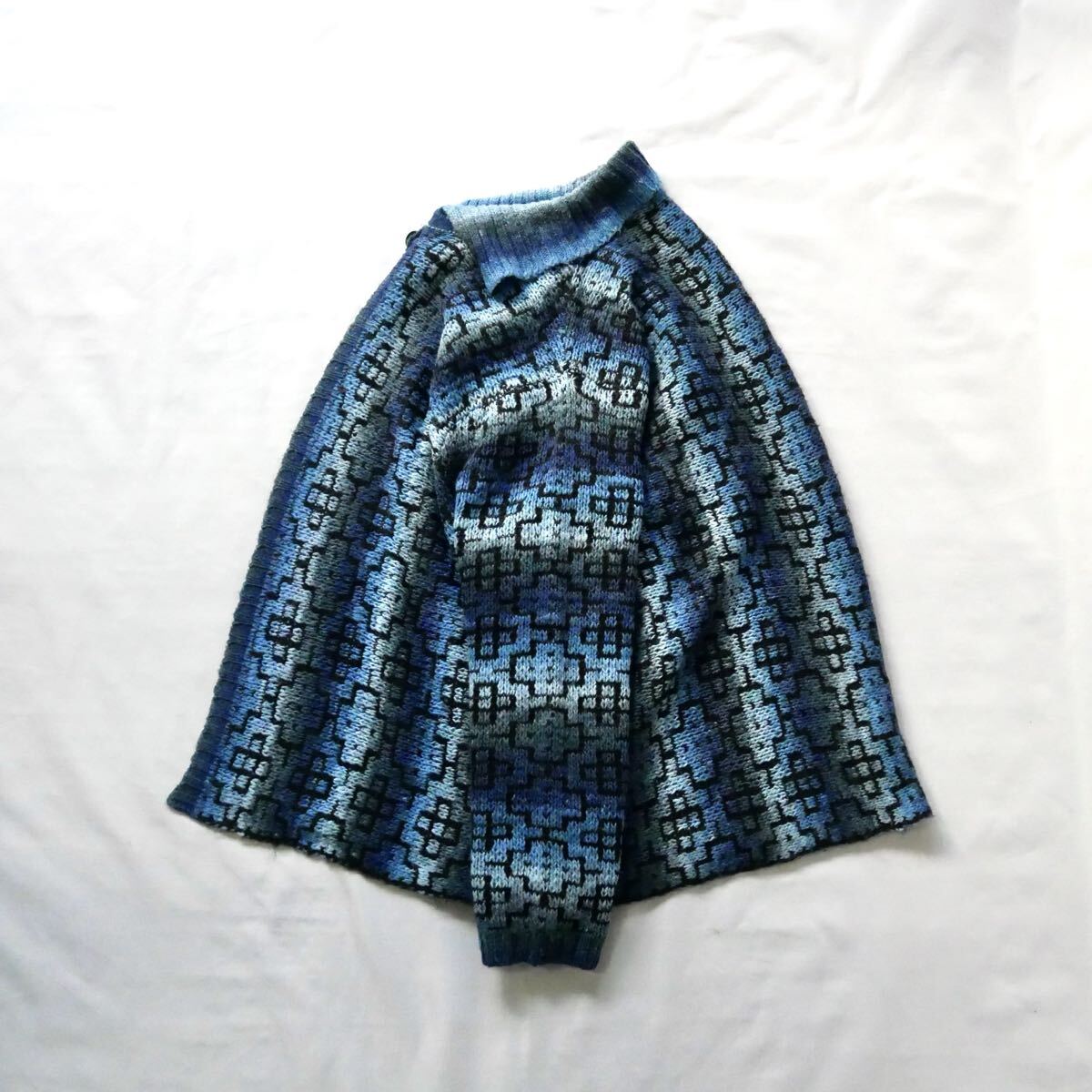 ブルーのネイティブ風柄が可愛いアクリルニットカーディガンです。