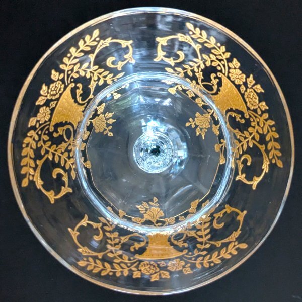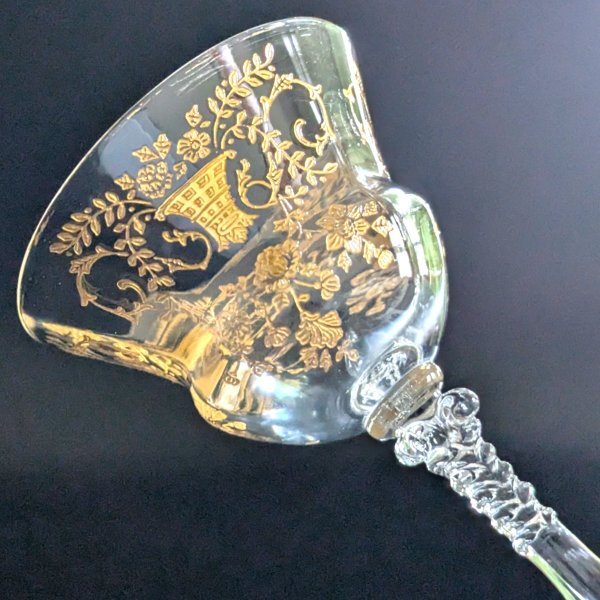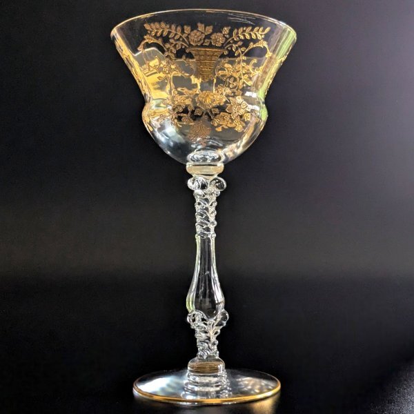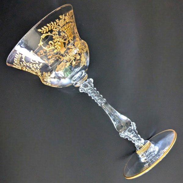 本品は、アメリカの名門ガラスメーカー「ケンブリッジ・グラス社(Cambridge Glass Co.)」による正真正銘のオリジナル作品で、「Portia(ポーティア)」シリーズの一点です。繊細な花籠文様のエッチングと優美なステムデザインは、同社が1930年代に製造した正規品特有の意匠と一致しており、リプロダクションやコピーではありません。信頼できるコレクター経由で入手した確かな真品です。