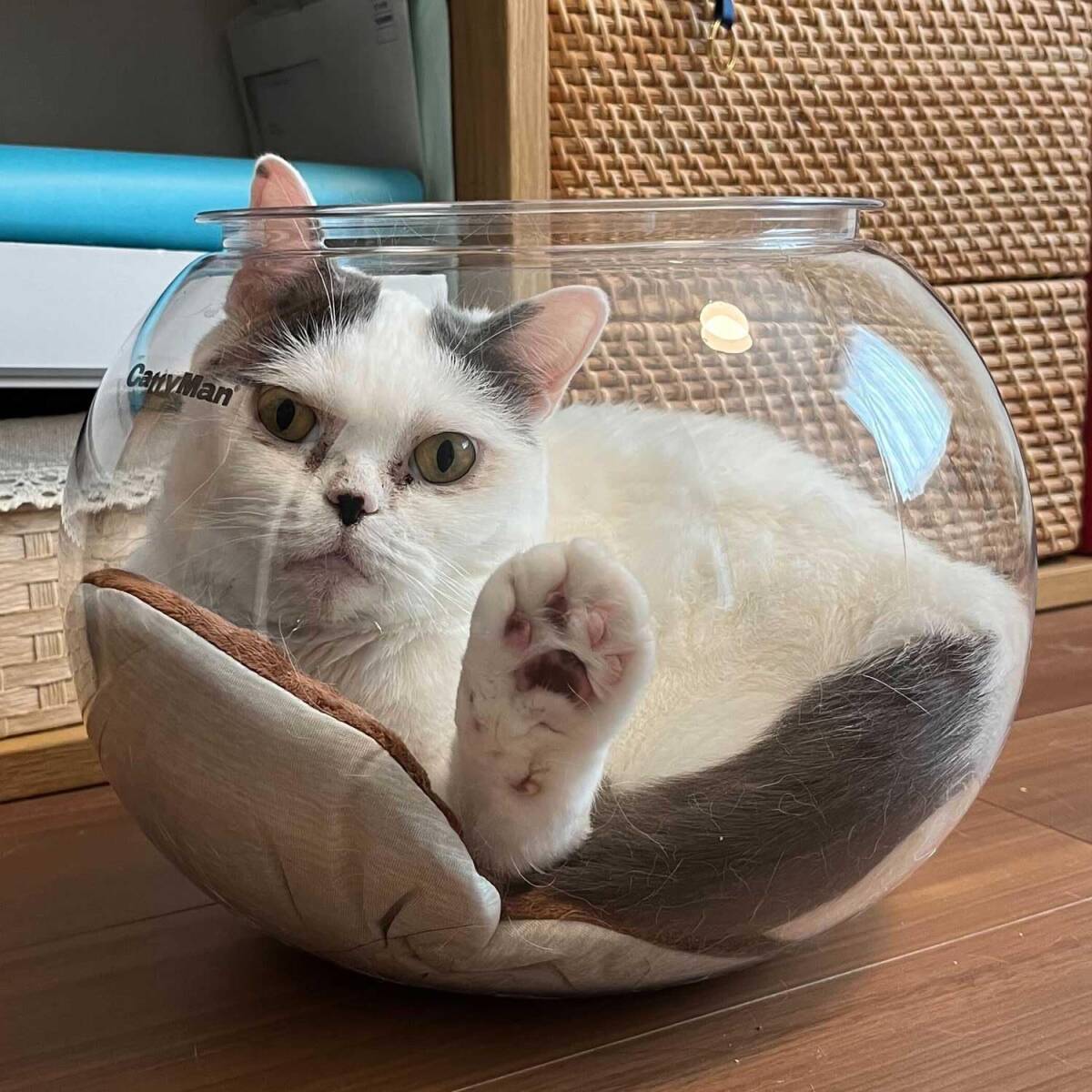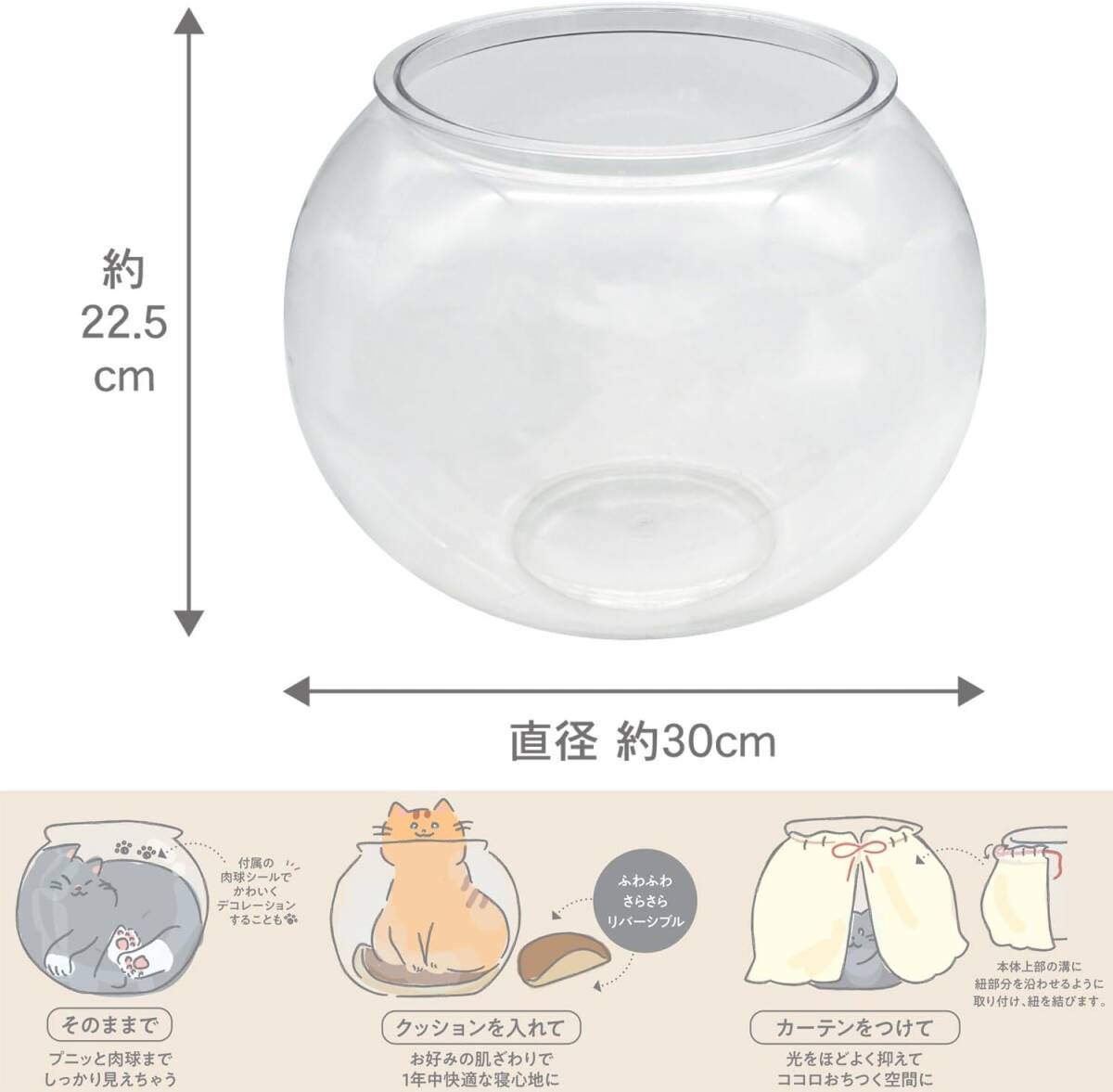 | ■■■■■■■■■■■□□□■■■■■■■■■■■□□□■■■■■■■■■■■□□□■■■■■■■■■■■□□□ (^-^*)/★私のオークションにようこそ★(^-^*)/ 商品紹介 猫ちゃんの体にフィット。落ち着けて、その可愛い姿が見える金魚鉢の猫ベッド。 透明で可愛い姿が見えちゃう金魚鉢の猫ベッド。 シーンや好みに合わせてカーテンを取り付け可能、そのままで プニッと肉球までしっかり見えちゃうカーテンをつけて 光をほどよく抑えてココロおちつく空間に