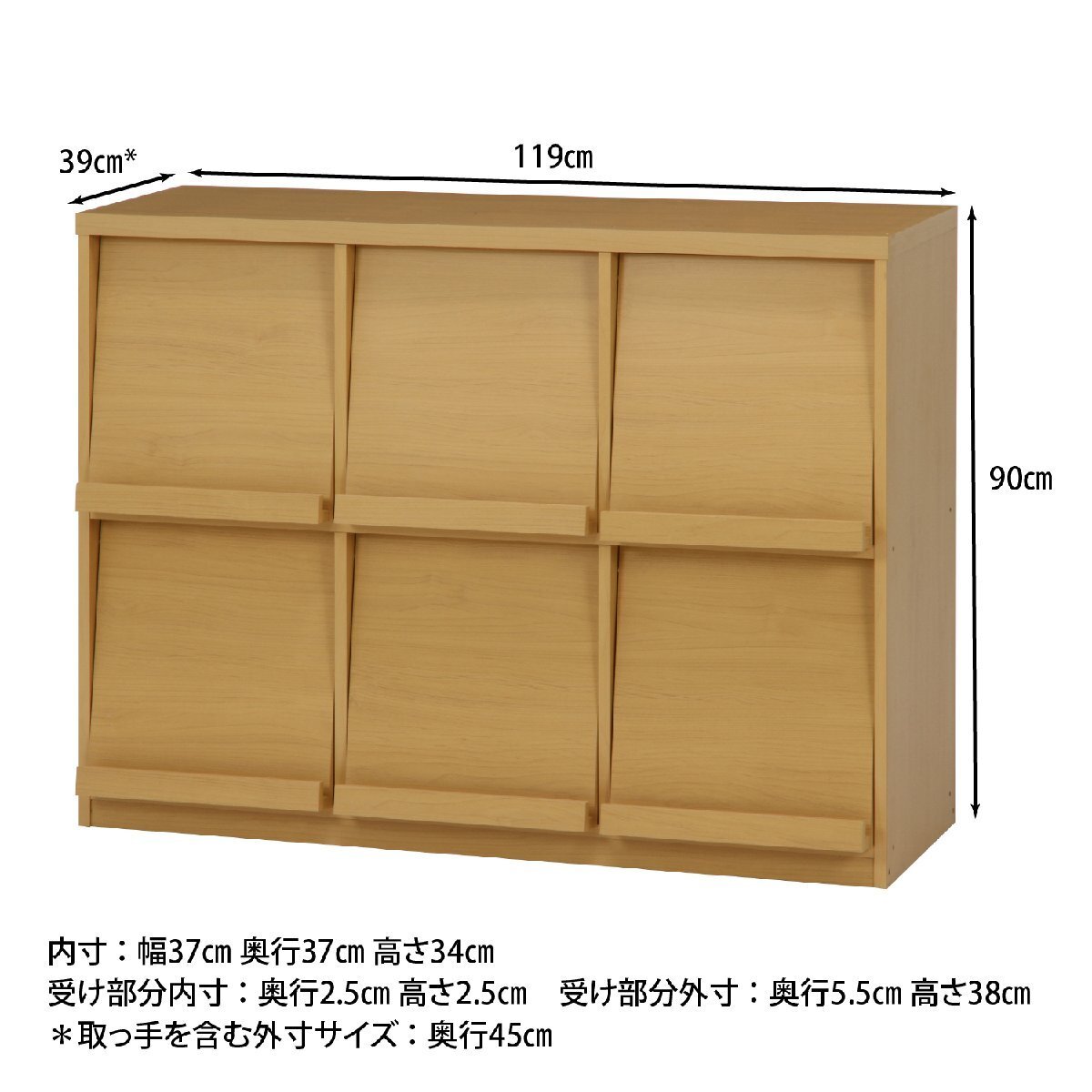 | サイズ | 全体:幅119×奥行39(フラップ扉45)×高さ90cm 扉を開けた(フタを中に入れた時)状態の内寸:幅 37×奥行 37×高さ 34cm 扉を閉めた状態の内寸:幅 37×奥行(上部約33cm)/(下部約37cm)×高さ 39.5cm |