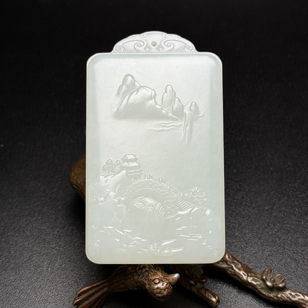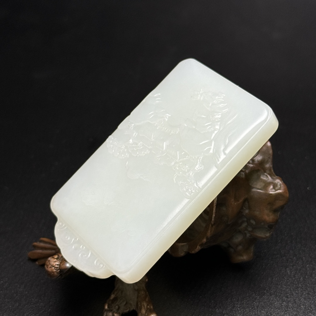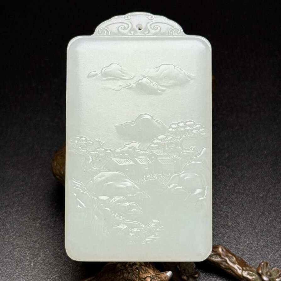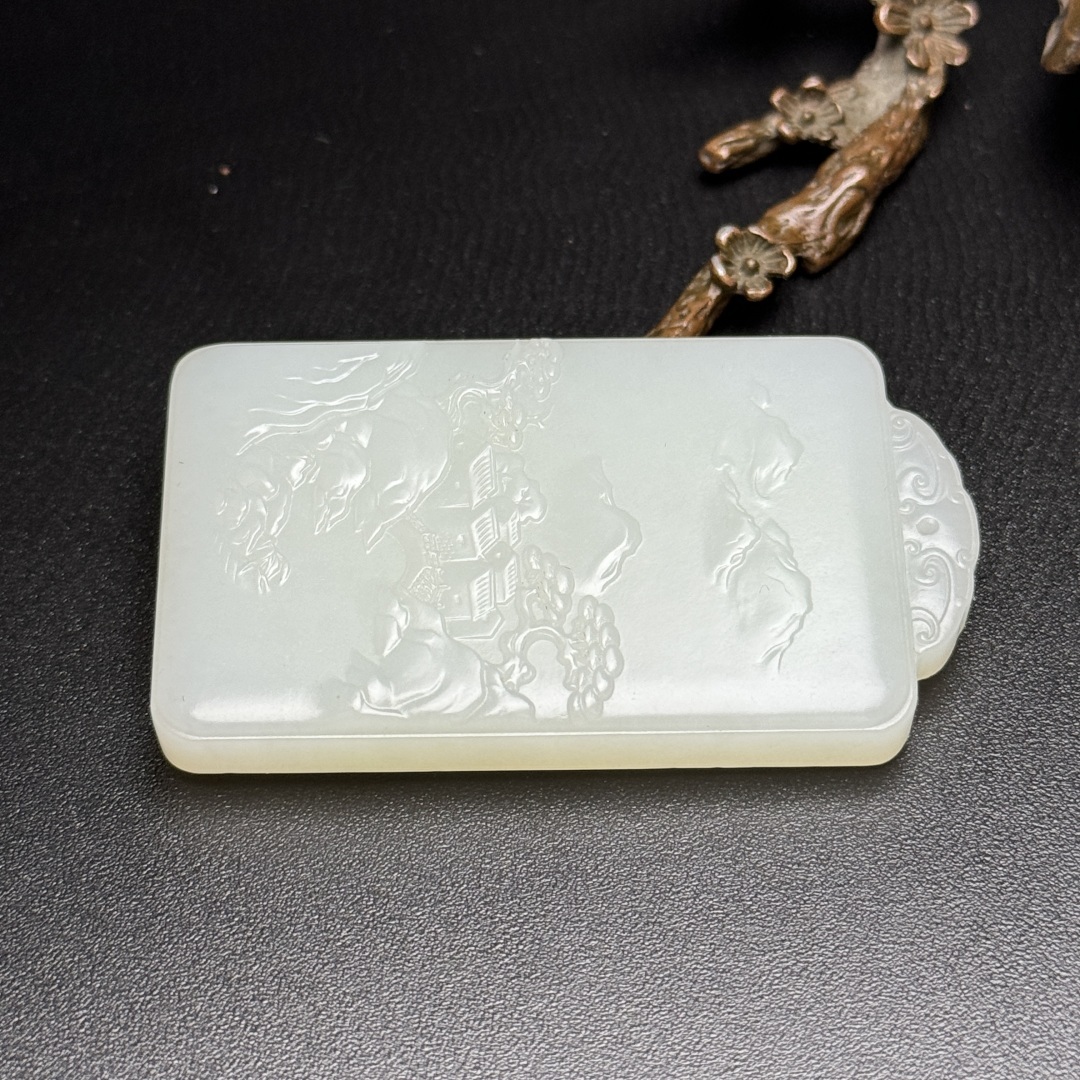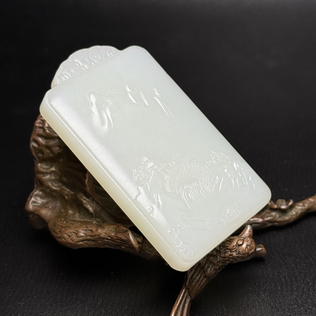 ◆御泓軒◆『清朝時代 和田玉 白玉彫 山水牌』極細工・古賞物・中国古玩・中国古美術