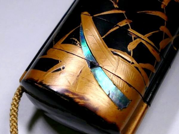 | 商品説明 | ~寸法~ 縦 約 8.0cm×横 約 4.3cm 雰囲気良き金蒔絵と 華やかな螺鈿細工により、 風情のある泊船雁芦文の施された一品です。 上質な唐木の布袋図 根付も付いております。 大切にして頂ける方の元へ届けば幸いでございます。 ~状態~ 状態は画像の通りとなります。 漆や螺鈿のはがれと経年による多少の小キズが見られます。 画像にてご確認下さい。 その他、許容範囲内の時代傷みはご理解下さい。 |