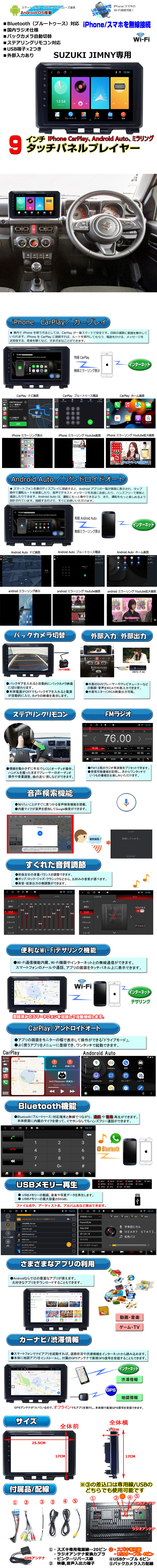 ジムニー専用パネルJB64 JB74 アンドロイド9インチカーナビAndroid12 iPhone CarPlay アンドロイドスマホ android auto ミラリング対応 スズキ専用配線 簡単可能 一年間保証あり