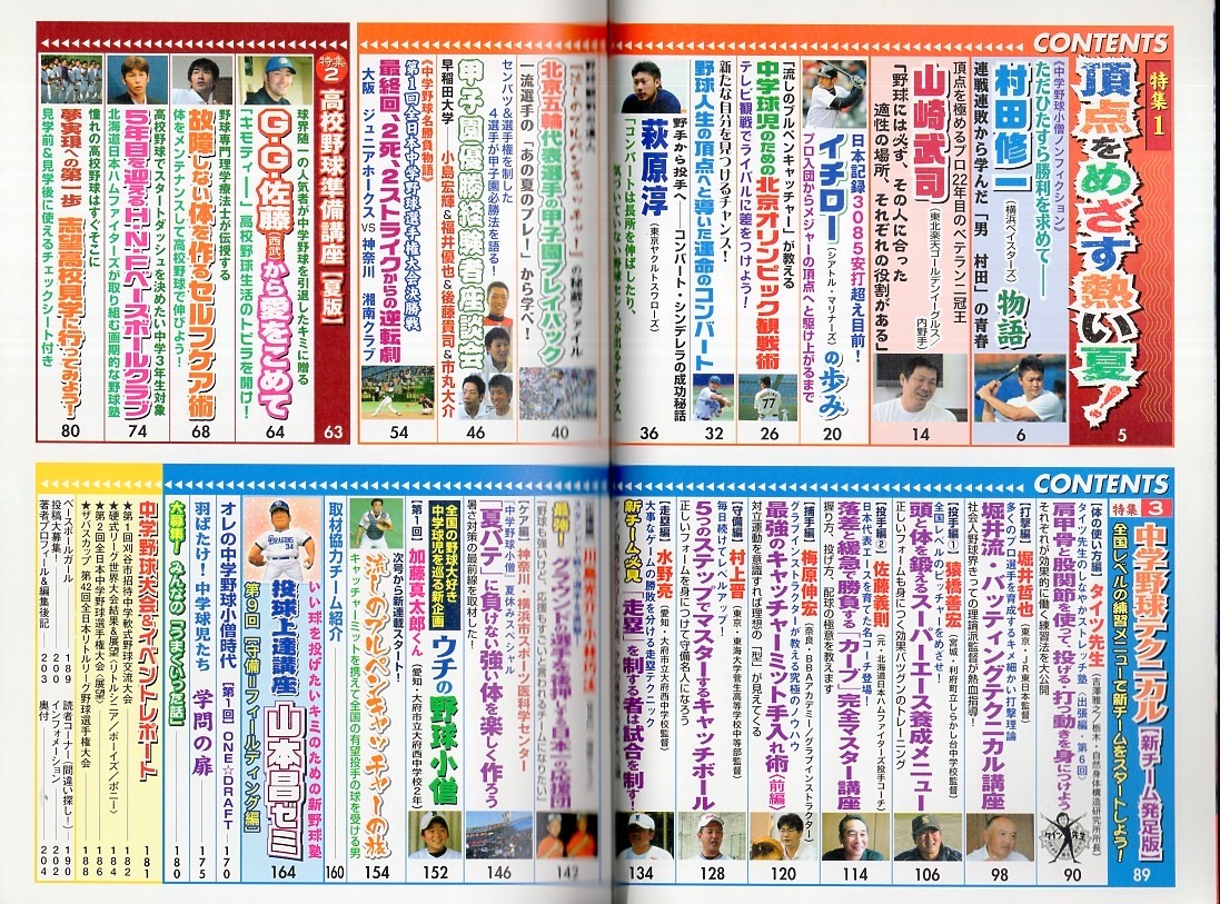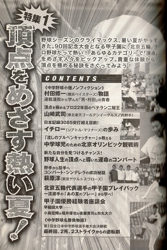 | 特集1 頂点をめざす熱い夏!-日本代表スラッガー・村田修一(横浜)物語、史上最年長の二冠王・山崎武司(楽天)、星野JAPANメンバーの甲子園秘蔵ファイル/特集2 高校野球準備講座【夏版】-日本代表選手/G・G・佐藤(西武)からのアドバイス、志望高校見学に行ってみよう!/中学野球テクニカル【新チーム発足版】-全国レベルの練習メニューで新チームをスタートしよう!! | |||