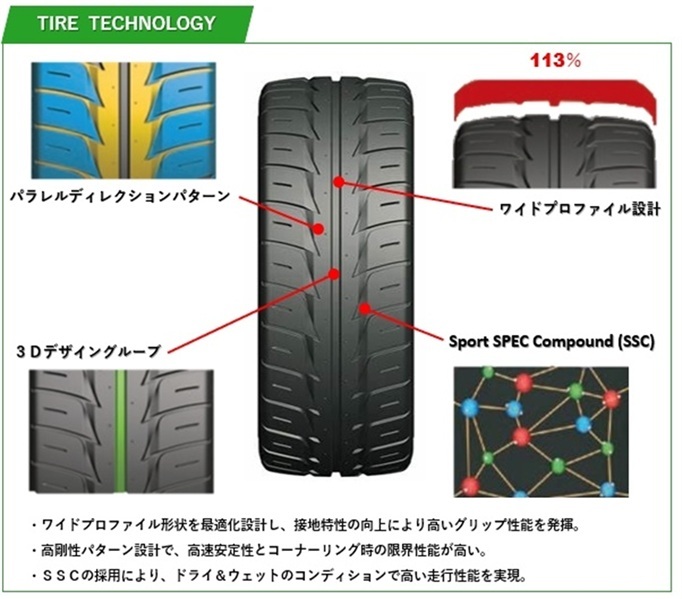 | ■商品説明 | 1.強力なドライグリップ 2.街乗りからサーキットまで高いパフォーマンス 3.コントロール性に優れ、扱いやすいスポーツタイヤ |