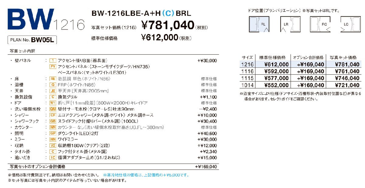 | ◎LIXIL集合住宅用ユニットバス[1216サイズ] BW-1216LBE+H 即決価格は、写真セット価格764.940円のなんと 71%OFFで 244.015円【消費税込】 ◆据付必要寸法1310×1680×2494mm。 ◆浴槽と洗い場床が分割構造、ラクに搬入・ラクに施工。 ◆バスルームの魅力をアップする光沢のアクセントパネルで豪華な雰囲気に。 ◆低床設置で、浴室への出入りがしやすい、浴室入口段差11mm。 ◆浴槽への出入りがしやすい、またぎ高さは約450mm。 ◆温度調整がしやすいサーモ機能付き水栓にエコアクアシャワー。 ◆翌朝にはサラリと快適、イージードライフロア。 ◆ワイドミラー・収納棚・フック付タオル掛・スライドフック付握りバーもセット。 ◆照明は、落ち着いた雰囲気のダウンライト照明(LED)2灯です。 ◆スッキリデザインで汚れにくく、お掃除しやすい『キレイドア』折り戸。 ◆ドア位置は4通り(RL・RC・LR・LC)から選択できます。 ◆追い焚きアダプターは価格に含まれていません。追い焚きをしないと、共用水栓に変更となります。 ◆天井換気扇・換気グリルは付いていません。 | |
