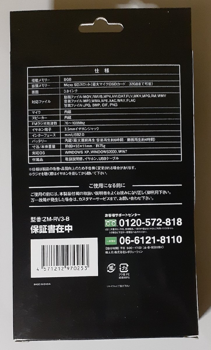 6250 ZM-RV3-B マルチメディアプレーヤー 3inch 音楽 動画 写真 内蔵メモリ8GB ボイスレコーダー FMラジオ カレンダー レボリューション