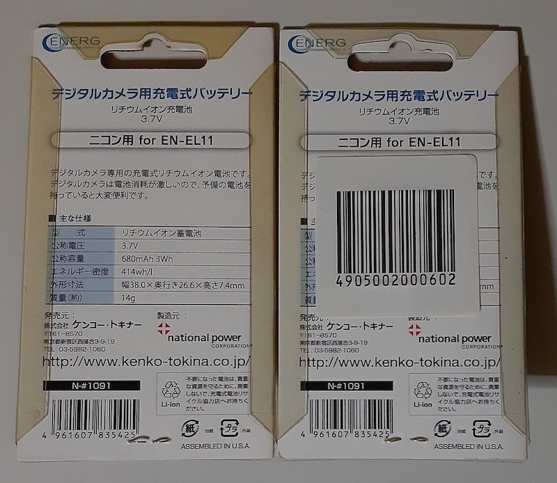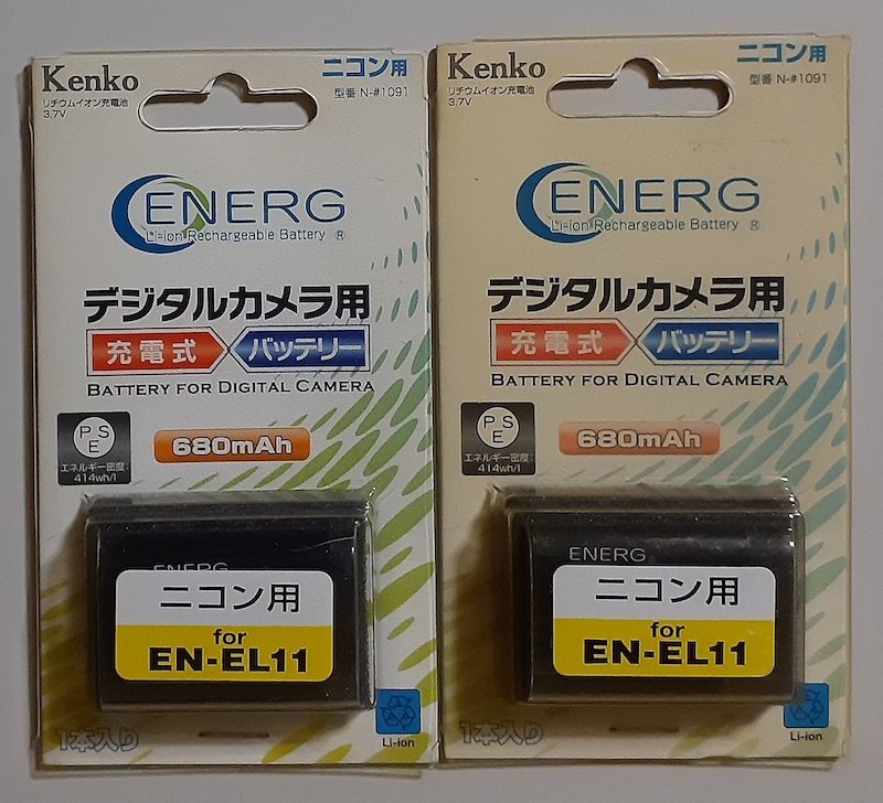 6263 未使用未開封 2個まとめて 互換バッテリー Nicon EN-EL11対応 ENERG リチウムイオン充電池 3.7V 680mAh N-#1091 ケンコー・トキナー