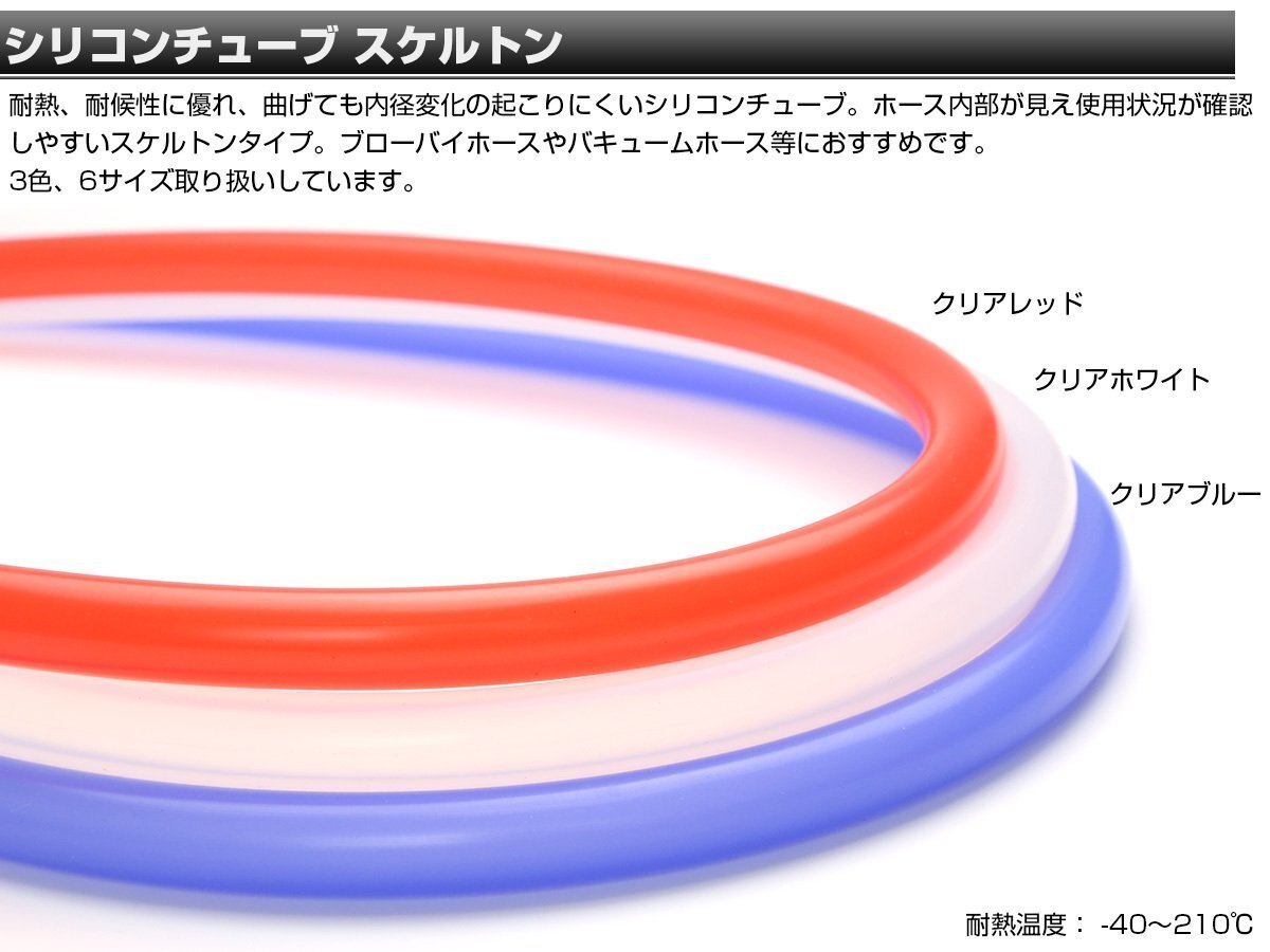 耐熱、耐候性に優れ、曲げても内径変化の起こりにくいシリコンチューブ。 ホース内部が見え使用状況が確認しやすいスケルトンタイプ。 ブローバイホースやバキュームホース等におすすめです。 3色、6サイズ取り扱いしています。 数量1で1mの切り売り販売です。 3m必要な場合は数量3でご注文下さい。 3mのつなぎでお届けします。 | ■ スケルトン シリコンチューブ ■ カラー:クリアホワイト ■ 内径:3mm 外径:9mm ■ 耐熱温度:-40~210℃ ■ 数量1で1mの販売です。 共通画像を使用しているため、必ずサイズ、カラーをご確認下さい。 耐油ホースではありません。オイルや燃料ホースとして使用しないでください。 他のサイズやカラーは⇒ こちら | |