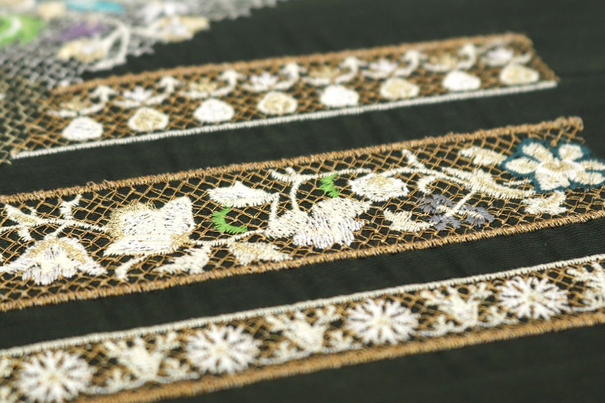 お太鼓や胴部分には白色、浅葱色、藤色、濃藍色、黄緑色、グレー、金銀糸などのお色目で、網目模様や唐花などが刺繍されております。