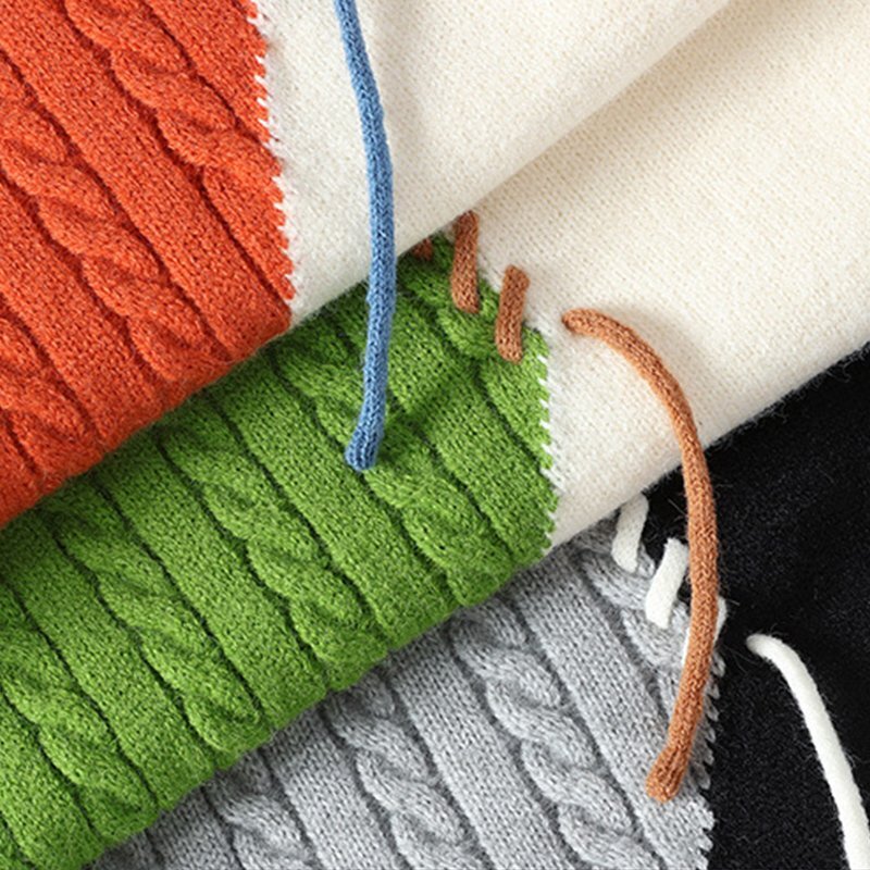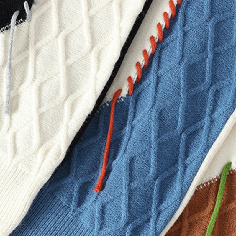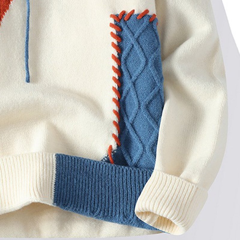 イタリア製 メンズ冬用ウール混紡セーター。柔らかく快適で保温性と通気性を兼ね備えたウール混紡素材を使用し、高級感を演出。ユニークなパッチワークジャカードデザインで、オレンジとブルーを組み合わせ、若者向けのトレンド感を表現。袖口、裾、ネックラインには伸縮性のあるリブ編みを採用し、手首やウエストにフィットして暖かく快適。胸元と裾のジャカード模様とステッチディテールが精巧で立体感を生み出し、クラシックなラウンドネックはシャツやジャケットとのコーディネートも簡単。オフィス、デート、カジュアルシーンに最適。イタリア製でラグジュアリーな品格を際立たせます。