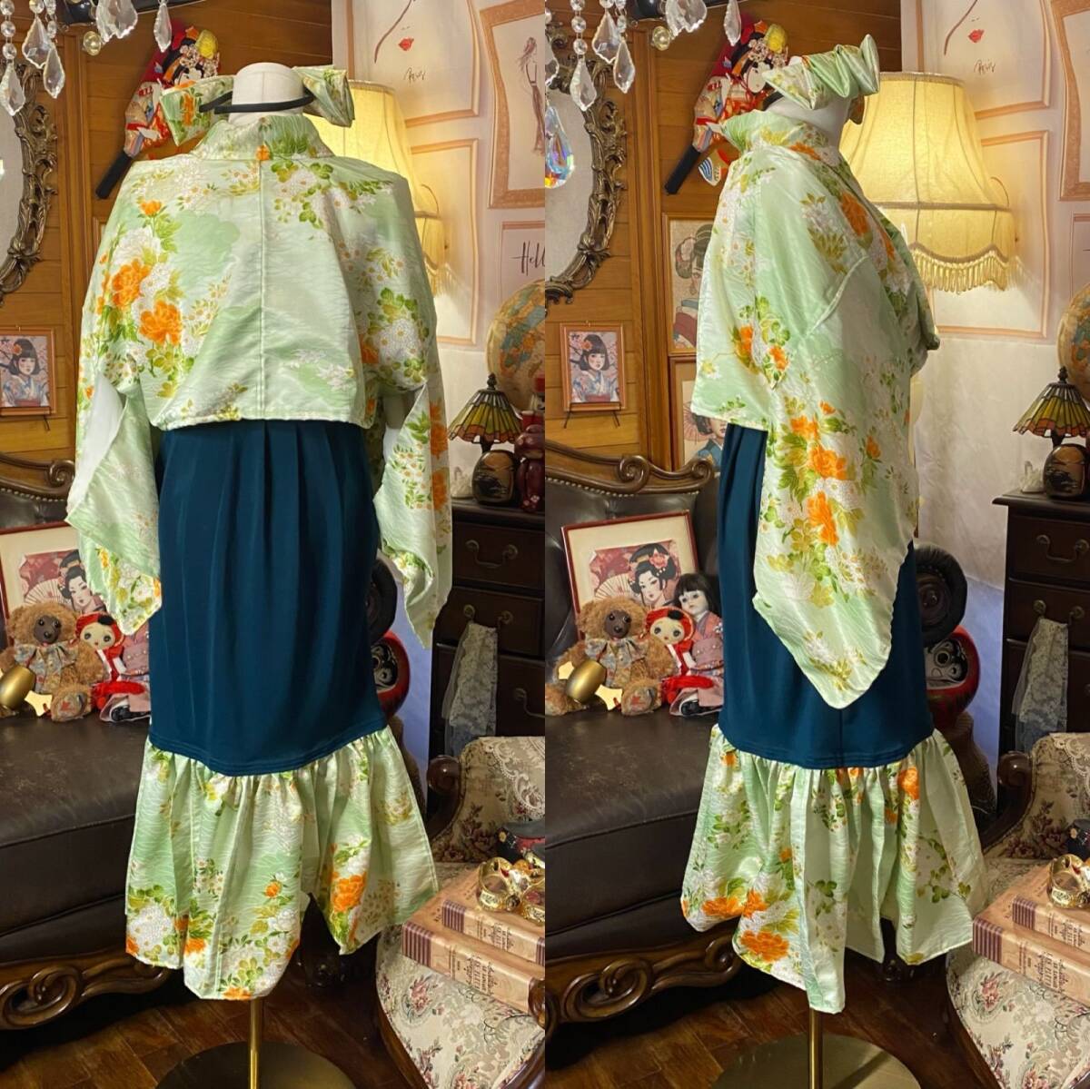 柔らかなミントグリーンに橙×白の花々が咲く着物生地をリメイク。光沢ある地紋がさざ波のようにきらめき、レトロ可憐なムードを纏います。ミント×深青×橙の配色が肌映えし、デイリー〜お呼ばれまで幅広く活躍。サステナブルな一点物のセットアップです。