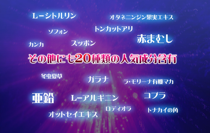 【原料成分】 | L-シトルリン、L-アルギニン、有機マカ末、トンカットアリエキス末、亜鉛、 赤マムシ末、冬虫夏草末、ソフォンエキス末、ガラナエキス末、スッポン末、 コブラ末、ロディオラ、オタネニンジン果実エキス、オットセイエキス、カンカ、 トナカイの角、無臭ニンニク末、ゼラチン、その他にもV.C、V.D、V.E等。 |