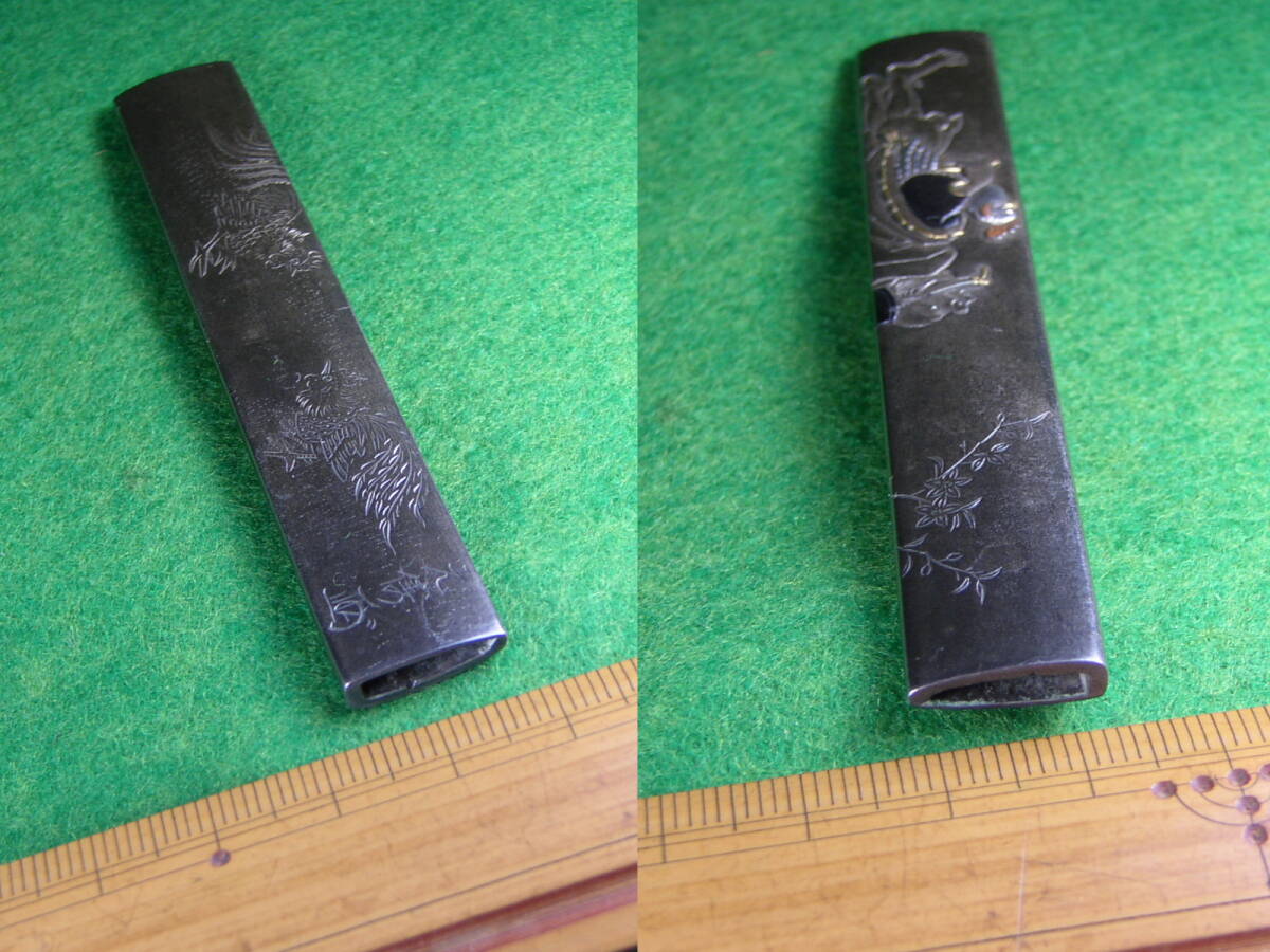 「裏」には激しく争う「闘鶏」と思われる図柄には「極々微細」な「霧雨」と思われ、消えうる様な「毛彫」が表現してあり、相戦う「二羽鶏・軍鶏(シャモ)」を誠に繊細な「毛彫」での見事な仕立てで、 朧銀磨地の「空間部」と「二羽鶏・軍鶏」との「構図」のバランスが誠に良くの「小口」寄りに「元儔(花押)」と在銘で「最上々」の見栄えする小柄です。
