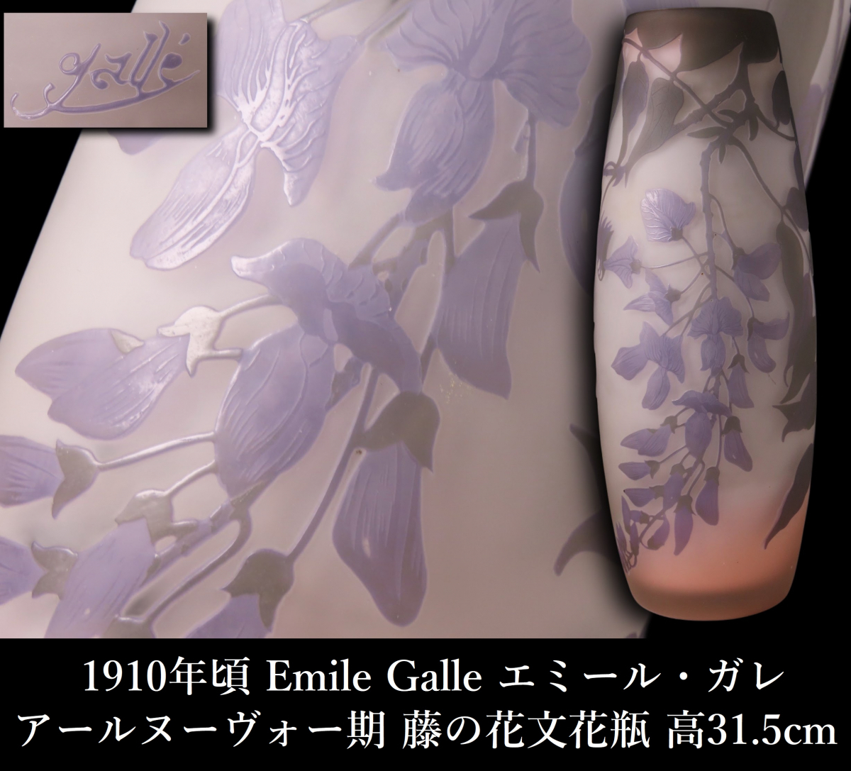 Lot.20251023HA250429ORX ※ご入札いただいた時点で下記記載事項全てにご了承いただいたものとさせていただきます。 ※商品タイトルは当方判断に基づき記載しております。また単にキーワードとして記載している場合もございますので予めご了承ください。 【ONE'S】本物保証 1910年頃 Emile Galle エミール・ガレ アールヌーヴォー期 藤の花文花瓶 多層被せ ウランガラス 保管箱付 西洋美術の頂点 百貨店購入品 シャルル・マルタン・エミール・ガレ(1846年~1904年) 19世紀フランスが生んだ偉大な芸術家 こちらの作品は、エミール・ガレの中でも特に人気の高い藤の花が描かれた、アールヌーヴォー期 1910年頃の作品でございます。 ベースガラスは白で、下段に少しだけほんのりとピンクが入った色のコントラストが素晴らしく、被せガラスで描かれた藤の花と葉が立体的で大変美しい花瓶です。 なかなかお目にかかることのないお品物をこの一期一会のご機会にぜひ。 【サイズ】 高さ(H):約31.5cm 直径(W):約12.5cm 【重量】 約1.57kg ※当方が測ったものですので、若干の誤差がある場合がございます。 【商品状態】 掲載画像をご覧下さい。 当方主観では状態の良いお品物であり、今後も末永くご愛用いただけるお品物でございます。 あくまでも年代物かつ一度人の手に渡っているお品物のため、神経質な方のご入札はお控えください。 PC上の画像と商品の色目が若干異なる場合がございます。 説明文に記載のある品物や写真に写っているもの以外は基本的に付属致しておりません。 落札後のトラブルを避ける為にも、説明文および画像をよくご覧になってから、ご入札のほどよろしくお願い致します。 商品状態の記載に関してはあくまでも当方判断基準となっております。 状態等の詳細は写真をご確認いただき購入者各自のご判断にてご入札ください。 | |||