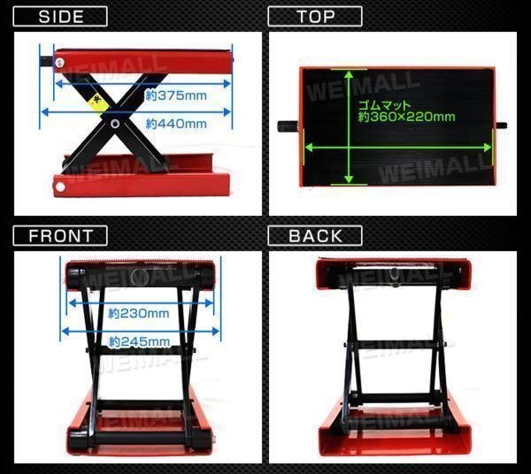 | 移動がラクなコンパクトサイズ フロント周りやリヤ周りの整備には欠かせないアイテムです。 【仕様】 有効使用高:98~365mm サイズ:220mm×360mm 積載能力:500kg(1000LB) 重量:13kg ※生産物賠償責任保険付(PL保険) ※商品サイズは商品画像をご参照下さい。 ※一部ご使用できない車種(フェンダーカバーが深いタイプやアンダーカウルの付いているタイプなど) もありますので、よくご確認の上ご購入して下さい。 | ◇車種やバイクの仕様により使用できない場合がございます。 ◇入荷状況により細かな仕様変更がございます。その場合、写真ではなく現物が重視されますので神経質な方は入札をご遠慮ください。 ◇当商品は海外製品になりますので、細かいキズ、ネジのゆるみなどがある場合がありますが、返品・交換対象とはなりません。神経質な方のご入札はご遠慮ください。 ◇商品内容はあくまでも出品概要に基づきますのでご注意ください。 ◇本商品を使用した際に発生したトラブル、事故につきまして、当社は一切の責任を負いかねます。 ◇メーカーではないため、専門的なご質問にはお答えできません。 ◇検品確認済みですので破損以外の交換には応じられません。商品到着時にはその場で開封、破損の有無を確認し、破損の場合には受け取らないか配送業者に申し出てください。 ◇加工および一度装着した商品の返品・交換には対応できません。事前の確認をお願いします。 また、商品の取付にかかわる費用等の弁済には対応できません。 ◇付属のコードなどの切断による、繋ぎ変えなどをされた商品に対しての、返品・交換は致しません。 ◇取り付けによる破損接続不良等責任を負いかねますので専門業者に依頼するかご自身の責任でお取り付けください。 |