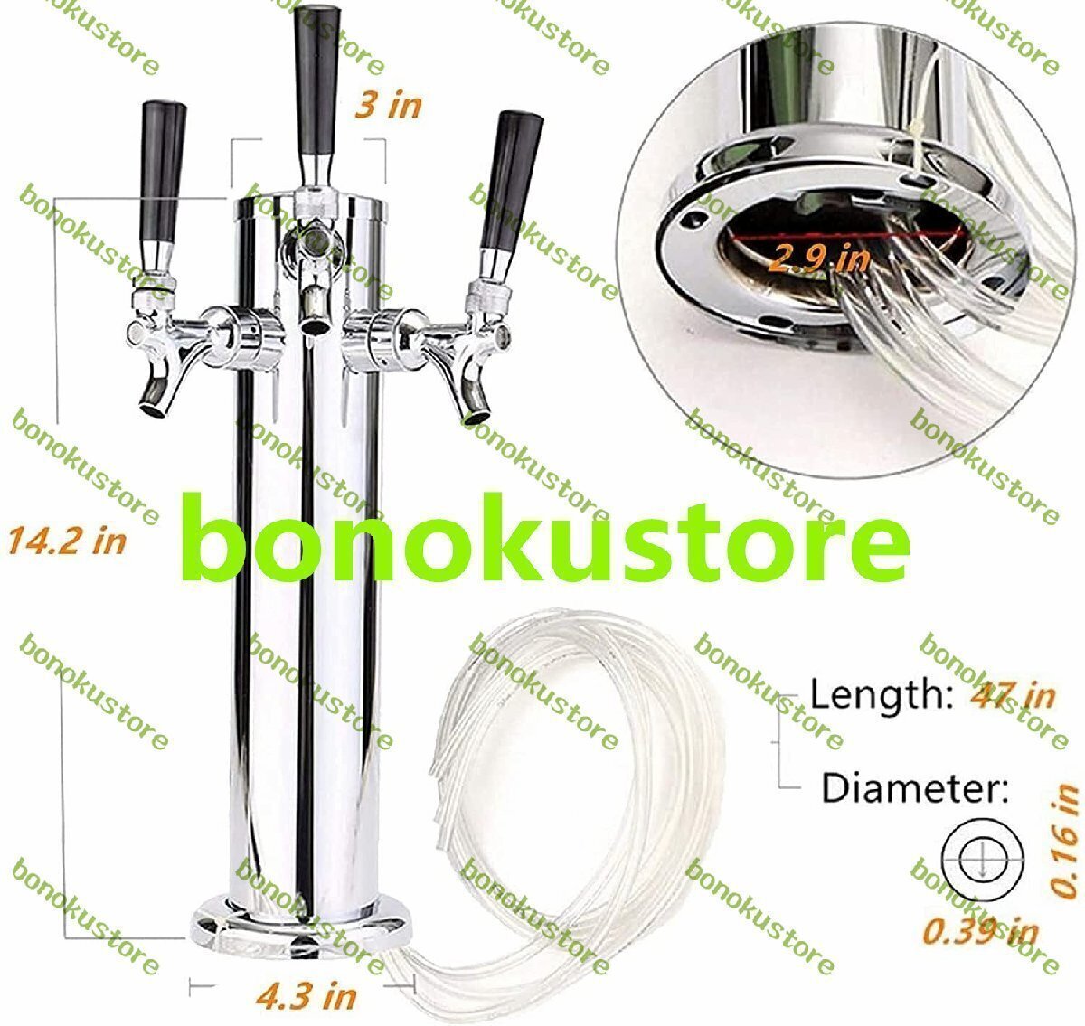 仕様: 材質: ステンレススチール + 真鍮 寸法: 柱(高さx直径): 14.2x3インチ チューブの長さ: 47インチ 重量: 5.13ポンド パッケージ内容: ビールタワー x 1 蛇口 x 3 4フィートビールチューブ x 3 小さなチューブ x 3 取り付けボルト x 4 タワーガスケット x 1 ホースクランプ x 12 多目的ケグレンチ x 1