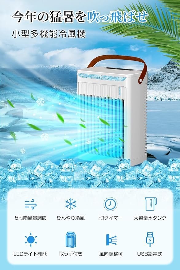 【 一台5役・超涼しい卓上冷風機 】 送風、冷却、ミスト加湿、マイナスイオン空気清浄、ナイトライトの5つの機能を兼ね備えている小型冷風扇は、扇風機より涼しく心地よい風を送る!超音波の力で大量の蒸発しやすい超微細ミストを放出し、そして、水が蒸発する際に周囲の熱を奪い、 冷風を届け 、心地よい清涼感が得られます。水に氷を入れると、室温より最大-11℃のヒンヤリ冷風を楽しめます。600mlの大容量水タンク、一回の給水で最大11時間涼しさが持続し、暑い夏の夜にもしっかり対応できます。* 同梱発送可能