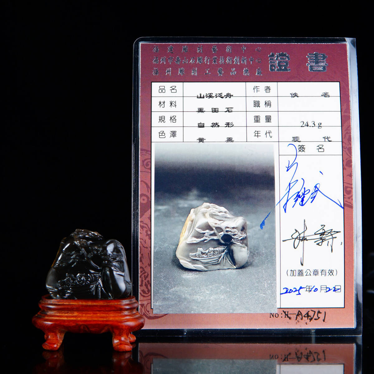 ◆御泓軒◆『金石篆刻 寿山石 黒田石彫刻 山渓泛舟置物 鑑定書付き』極細工・古賞物・中国古玩・中国古美術