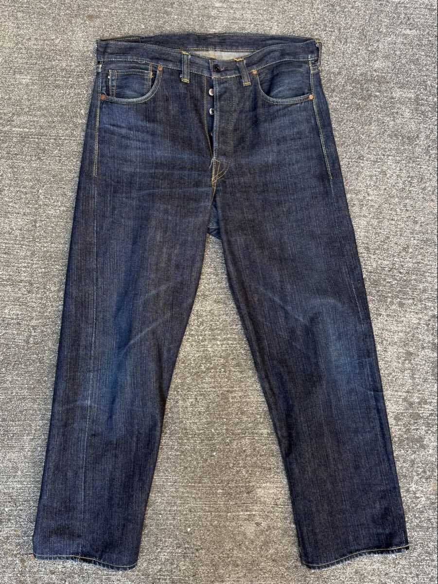 初期発売の左綾デニムのONE PIECE OF ROCK Vallejoで薄くアタリが出てますがその後、1年以上履かずに保管していたのでボタンには、錆があるのと裏地が薄く黄ばんでる為、黒ずんだ色落ちになってますので好きな方には、おすすめです。
