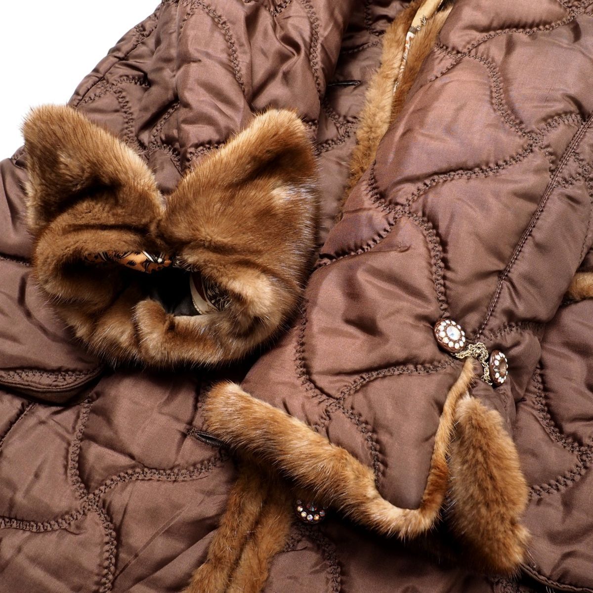 | TJ4099☆イタリヤ 伊太利屋 ITARIYA GK キルティングコート ミドルコート ミンクファートリミング 裏地アニマル柄 ブラウン系 サイズ11 | |||