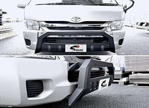 200系 ハイエース ワイド スクエア グリルガード マットブラック ブラックパウダーコート仕上げブッシュバーになります。 極太の角パイプがよりスパルタンな印象を与えるマットブラックのブッシュバーになります。 アウトドア仕様やシティオフロード、仕事用等様々な仕様のハイエースにピッタリです。 リフトアップしたオフロード仕様のハイエースなどのドレスアップには特に最適です。 スキッド プレートは取り外しても使用可能です。 弊社オリジナル商品となります。 ■・トヨタ ・200系 ハイエース/レジアスエース ・1型~6型 ワイド ■簡単取付5ステップ 1.ナンバープレートを取り外し、牽引フック蓋を外します。 2.既存の穴に付属のボルトを止めます。 3.バンパーガードのスキットプレートを外します。 4.ボルトの先端にバンパーのステーを引っ掛けボルトで締めます。 5.スキットプレート・ナンバープレートをバンパーガードに取り付け完了となります。 ※ボルトが入りにくい場合はワイヤーブラシ等でボルトの塗装を剥がしてください。 ※5型のTSSセンサー装着車に関しましては今の所、不具合報告はございませんが、補償の対象外といたします。 ※6型のTSSセンサー車につきましては、検証の結果 約10%の車両においてセンサー不具合が起きております。 90%のお車については、不具合はありません。 TSSセンサーや他のセンサーの問題による返品交換は一切お受けいたしかねます。 TSSセンサーの不具合やそれに付随する保証・補償・補填等一切責任をとれません。 以上のことを踏まえて購入をお願い致します。 ※ナンバーのボルトは既存のボルトをお使いください。 ナットが付属いたしませんのでお客様にてご用意お願いします。 ※取付に関しての説明書は付属していません。 ※取付サポートはおこなっておりません。 ※車検の合否についてはお答えしかねます。 未使用品ですが社外品になりますので多少の輸送傷等がある場合が御座います。| ★送料について★ |