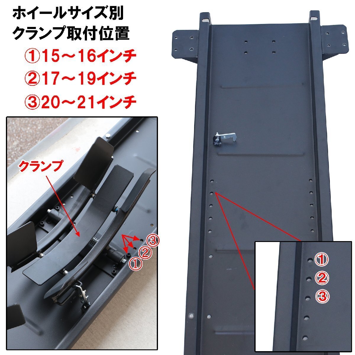 | 仕様 | 本体サイズ:全長約2950mm×幅約550mm×高さ約335mm 車両適応範囲:全長約2500mm内 レール内幅:270mm 耐荷重:約500kg 重量:約40kg カラー:ブラック 材質:スチール |