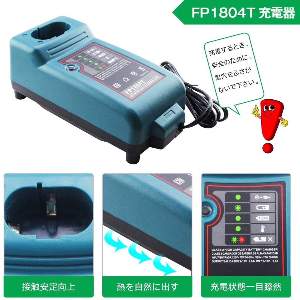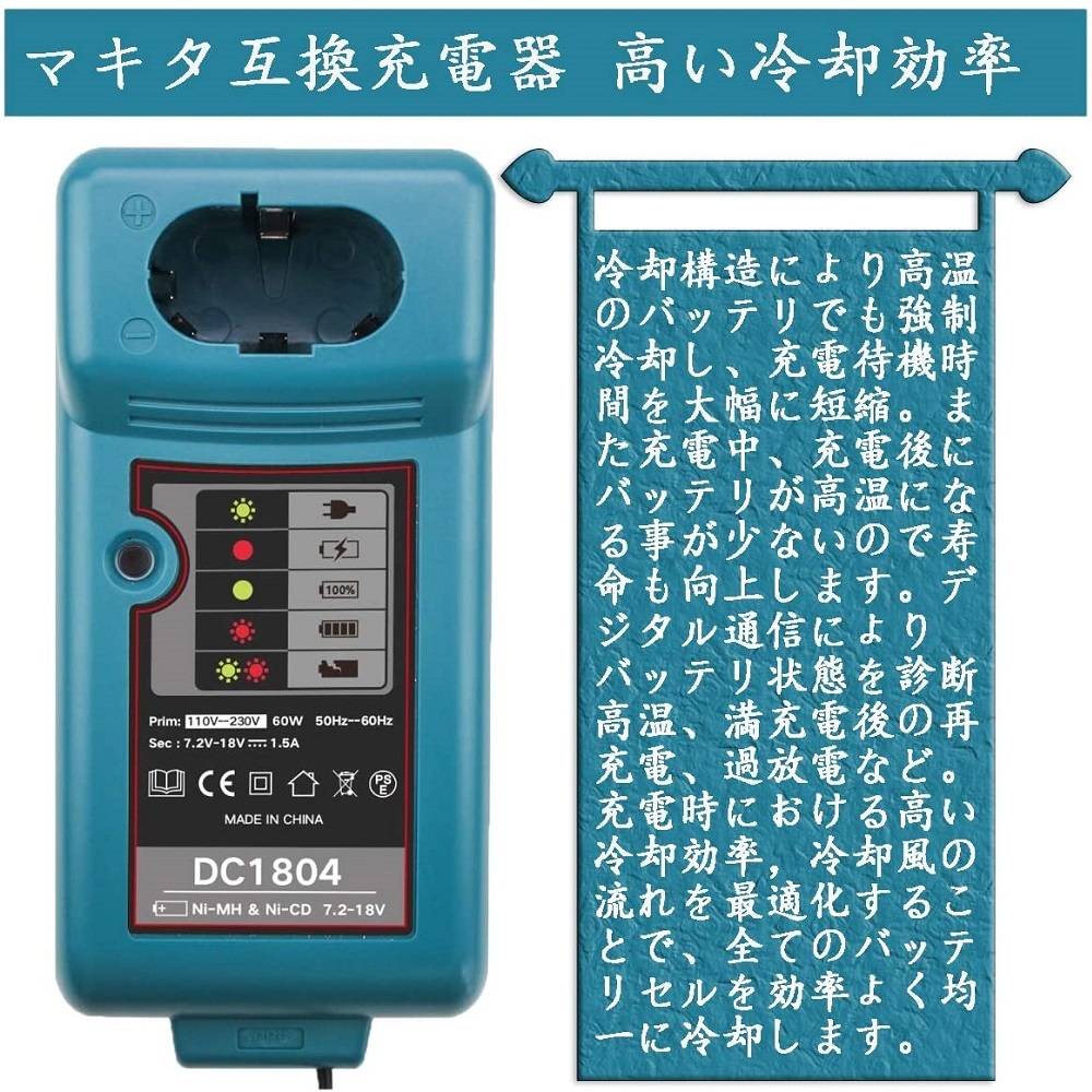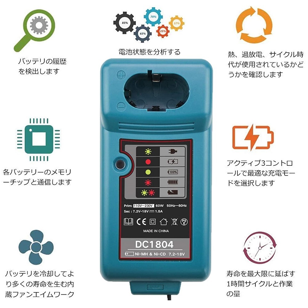 | 商品名 | DC1804 makita マキタ互換充電器 7.2V 9.2V 12V 14.4V 18V マキタバッテリー ニカド電池 ・ ニッケル水素電池 用 |