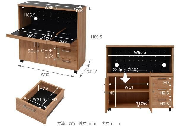 【サイズ】 <外寸> 幅90×奥行41.5×高さ89.5cm <内寸> 引出し:幅21.5×奥行33×高さ7.5cm 下部扉内:幅51×奥行36×高さ40cm スライド部大:幅54×奥行33×高さ35.5cm スライド部小:幅25×奥行33×高さ35.5cm スライド引き幅:32.5cm 下部扉内可動棚:幅56.5×奥行35×厚み1.5cm(3.2cmピッチ5穴) 天板:幅90×奥行41.5×高さ89.5cm 【耐荷重】 天板:(約)30kg以下 可動棚:各(約)5kg以下 スライド棚大:(約)5kg以下 スライド棚小:(約)3kg以下 引き出し:各(約)3kg以下 【材質】 本体:プリント紙化粧合板 【生産国】 マレーシア 【梱包】 サイズ:96.5×43×20cm、重量:37kg 【その他】 ・背面化粧有り ・可動棚:1枚 ・合計1500Wの2口コンセント付き(コード長さ 200cm) ・キャスター5個(うちストッパー付き2個) 【組み立て品】 お客様による組み立てが必要です。 |