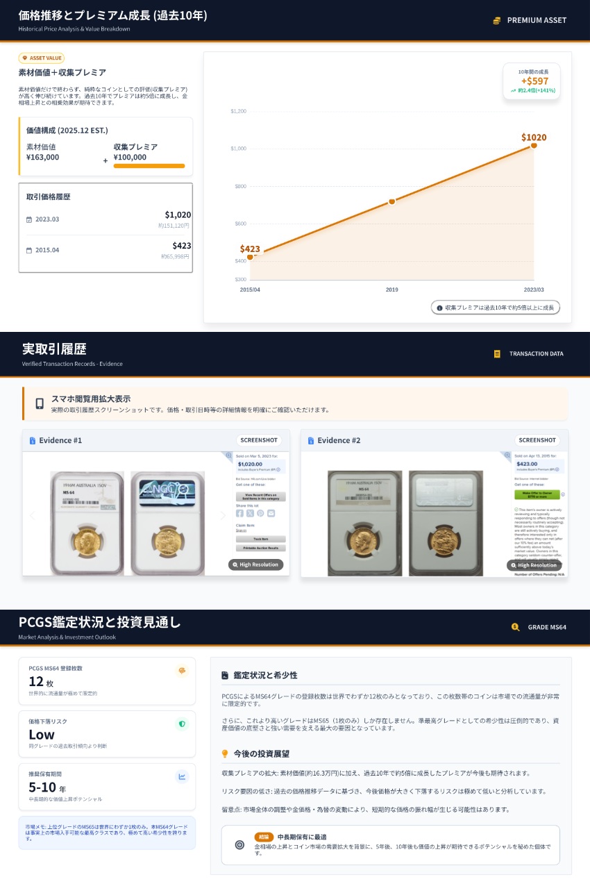 2023年3月には1,020ドル(約151,120円)、2015年4月には423ドル(約65,998円)で取引されており、過去10年のデータを見てもプレミアは確実に増加傾向にあります。資料に実際の取引履歴の画像を掲載しておりますので、ご確認ください。素材価値を差し引いても、過去10年間で収集プレミアが約5倍以上に成長していることが数字から読み取れます。金相場の上昇とコイン市場の需要拡大を考慮すると、5年後、10年後も価値の上昇が期待できるポテンシャルを秘めた個体です。