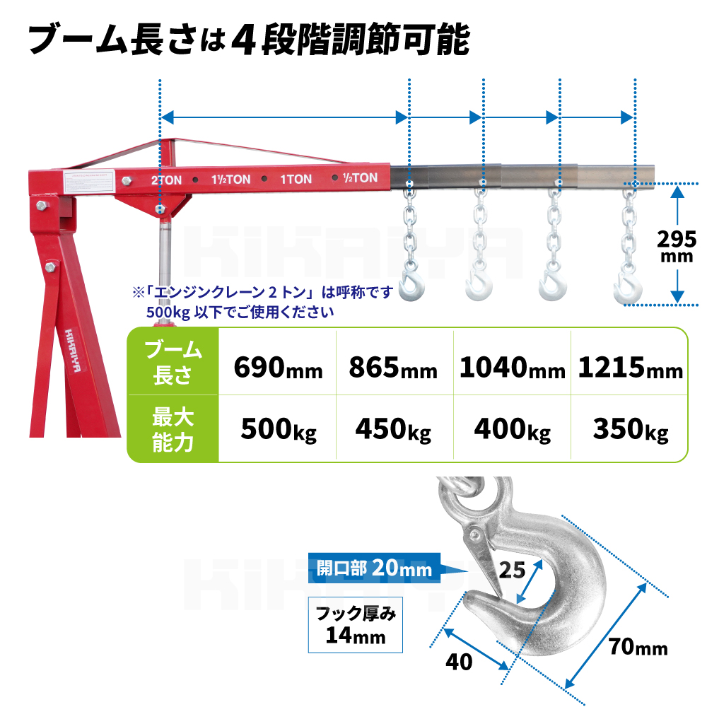 | ブーム長さ/最大能力 | 690mm/500kg 865mm/450kg 1040mm/400kg 1215mm/350kg |