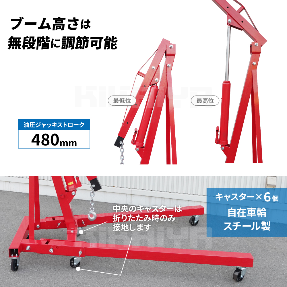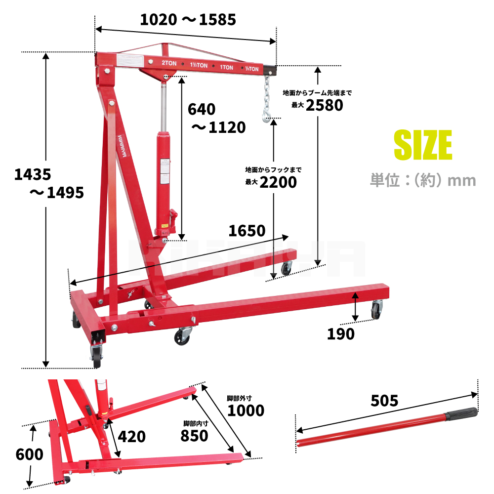 ☆「エンジンクレーン2トン」の「2トン」は呼称となります 荷の位置保持ではなく、吊り上げ専用として荷重500kg(最大伸長時350kg)以下でご使用ください 【ご注意】 ※本製品はエンジンの吊り上げを想定した商品です 本来の目的以外には使用しないでください |