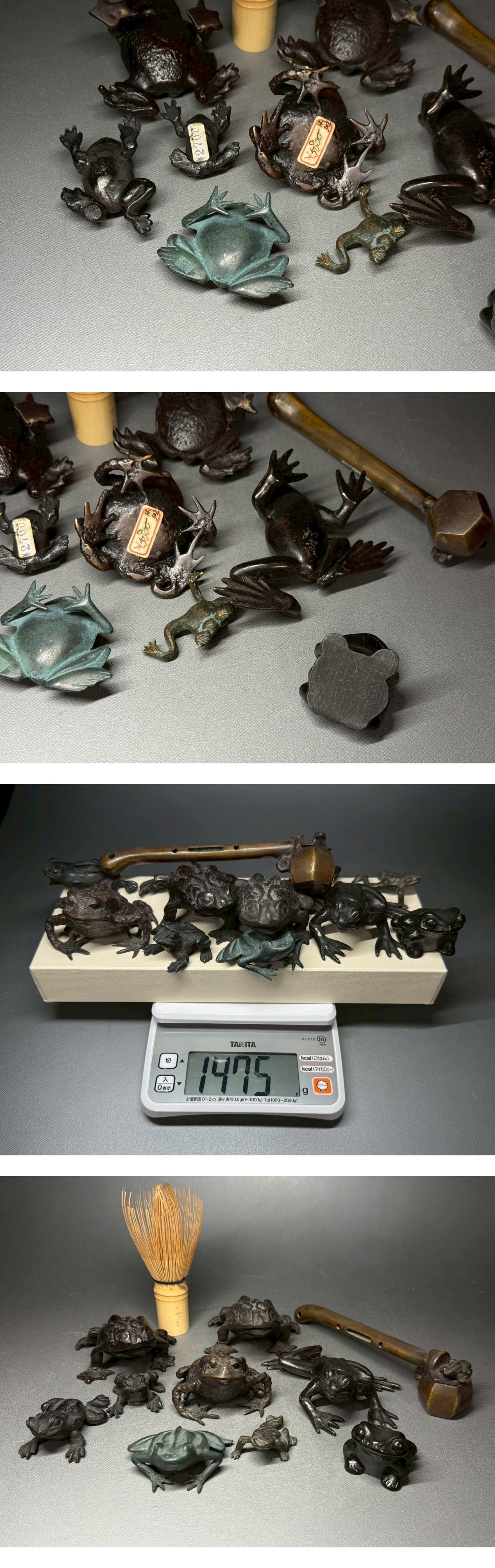 ●【蔵出】時代物 青銅 蛙 10点 重量約1475g 置物 纏め 銅製 文鎮 縁起物 蝦蟇 金運 磁石反応無 重厚 カエル かえる 金属工芸 飾物 ■個数:10点 ■重量: 1475g ※素人寸法の為、若干の誤差はご了承ください。 ■状態につきましては経年に伴うスレ・汚れ・小キズ などが見られます。 ※その他の細かな状態は写真にてご確認・ご了承の上 ご入札くださいませ。 ●こちらの商品などは時代物や古いお品・骨董品となり ますので、細かな状態を気にされる方・神経質な方の ご入札はご遠慮くださいませ。 |