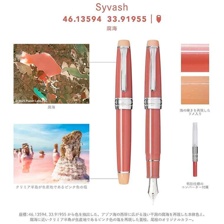 SATELLITECRAYON PROJECT「海のクレヨン」コラボ製品 海の万年筆「Syvash (腐海)」 プロフェッショナルギア 21金 MF(中細) 限定生産 新品 ※今回はSyvash (腐海)1本の出品です。 ![]() セーラー万年筆より、宇宙から撮影した地球の色から作られた SATELLITE CRAYON PROJECT「海のクレヨン」とコラボレーションした限定シリーズが登場。 海の万年筆は、「海のクレヨン」12色の中から、 バハマのエルーセラ島西部の海を再現した「Eleuthera Island」、 日本の奄美大島の海の色である「Amami Oshima」、 黒海の北端アゾフ海の西岸に広がる浅い干潟の腐海を再現した「Syvash」の 3色を選定し、万年筆とインクに落とし込みました。 ※「Amami Oshima」はプロフィットジュニア+10のみの展開となります。 地球に実在する海の色の豊かさがそのまま再現された万年筆やインクを、 その場所のストーリーとともにお楽しみください。 ![]() こちらのページでは、海の万年筆をご紹介いたします。 『プロフィット』のフォルムを残しながらスタイリングは独自の美しさを誇り、 装飾にはこだわりのオリジナリティを随所に打ち出したプロフェッショナルギアシリーズ。 本物であることを実感させる書き心地。高級感を醸し出すオリジナリティ高い装飾性。 ステイタスを演出するプロフェッショナルギアの万年筆です。 ![]() 約一年をかけて実現したコラボレーション。 「海のクレヨン」は、衛星写真から世界中の海の色を抽出して作られた12色のクレヨンのセット。 どの色で万年筆やインクを作ろうかと迷いましたが、「海のクレヨン」を作るきっかけとなったという きれいなピンクの腐海の色、海のクレヨンの中でも人気があるという 美しい青緑色のエルーセラ島西部の海の色、そして唯一日本の海の色である 真っ青な奄美大島の海の色をラインアップすることにしました。 (※今回はSyvash (腐海)1本の出品です) ![]() 海の色をそのまま再現できるよう、万年筆やインク、パッケージの色味を追求したり、 海の色を採った緯度経度をデザインするなど、細部までこだわりが詰まっています。 SATELLITE CRAYON PROJECTの「宇宙から見つけた地球の色を通して、 地球をもっと知りたくなるきっかけをつくる」というコンセプトから、 セーラー万年筆では独自の取り組みとして、海の万年筆シリーズ製品の売り上げを GSHIPの運営者である広島県に寄付し、瀬戸内海の環境保護のために活用いただきます。 ![]() 万年筆の命ともいえるペン先は、大型の21金のペン先。 セーラーのペン芯は精密な機械で作り出され、ペン先の仕上げも万年筆職人により 1本1本厳しく検査された後、素晴らしい製品として送り出されるのです! ですから、どの万年筆も安定したインクフローと書き味を楽しむことができ、 時代を超越したしっかりとしした書き味・インクフローにもセーラーの誇りが生きています。 ![]() ※今回はSyvash (腐海)1本の出品です。 ![]() 海の万年筆共通のオリジナルパッケージ。 表面には波のような箔をあしらった高級感のあるデザインです。 蓋を開けば、モチーフとした海が大きく広がります。 内蓋部分は2層構造で、水面のような箔をあしらいました。 海底に隠されたように万年筆が顔をのぞかせ、ボディのラメが 光を浴びた海のようにキラキラと輝きます。 ここでしか手に入らないパッケージをぜひお楽しみください。 ********************************************************************** ≪詳細 ≫ SAILOR 限定販売 海の万年筆 Syvash (腐海) ペン先 :21金 大型 ロジウムプレート サイズ : MF(中細) 機構 : カートリッジ・コンバーター両用式 材質 : PMMA樹脂 長さ : 129mm 太さ : 18mm 重さ : 21.6g 付属品 :専用ボックス・保証書・説明書・カートリッジ カラーコンバーター(内蔵) 状態 : 新品未使用 ※気候や室内の温度変化、またセーラー出荷前の洗浄により、 ペン先に僅かな水滴がついている場合がございます。 予めご了承ください。 ********************************************************************** |
