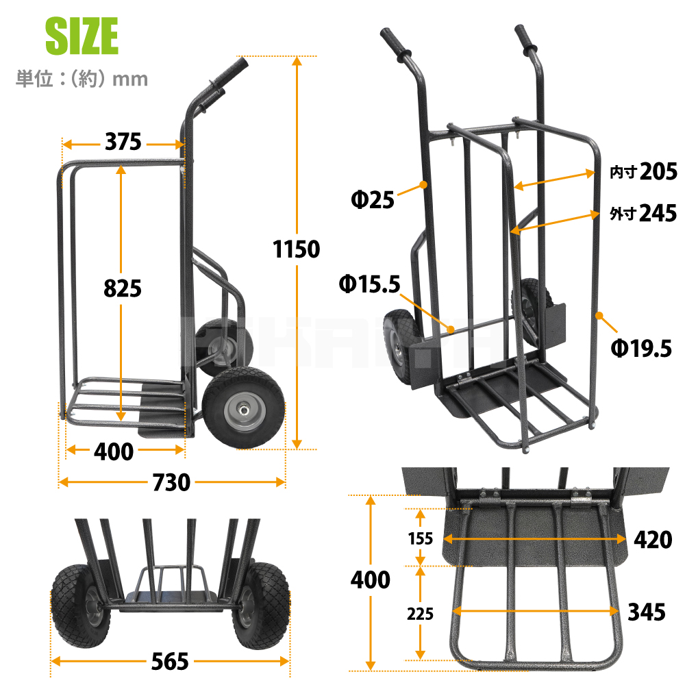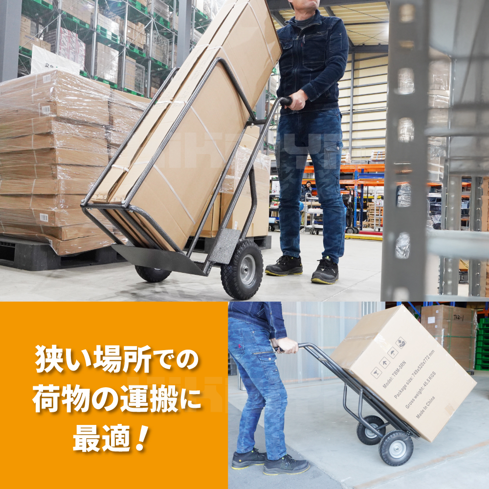 狭い場所での荷物の運搬に最適! ●荷の落下防止対策用のサイドガード付き ガードなしでのご使用も可能です ●車輪はエアー管理不要なノーパンクタイヤ ●タイヤへの巻き込み防止ガード付き ●ハンマートーン仕上げで傷がついても分かりにくい ●握りやすいハンドルグリップ付き ●縦置き/横置きどちらも可能です ●お客様ご自身で組み立てが必要な商品です(10分程度/1人) 必要工具:スパナ(12mm・13mm)、ペンチ |