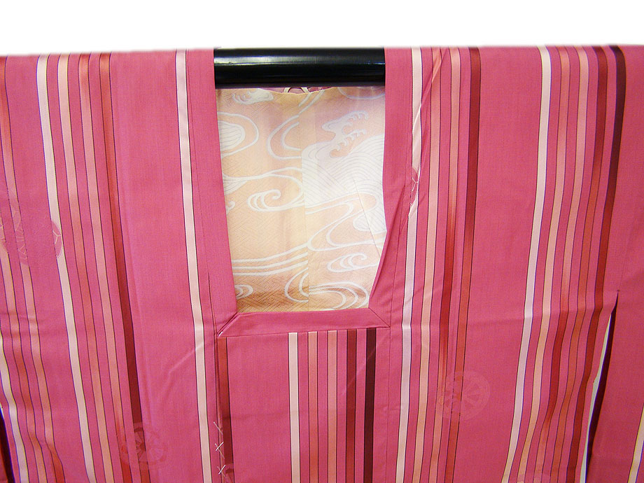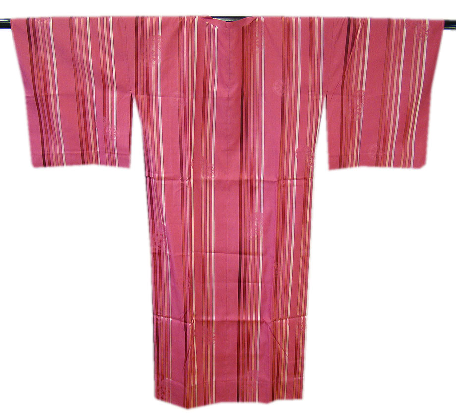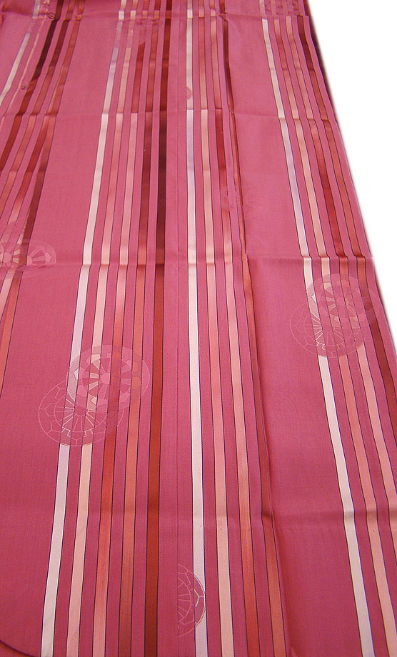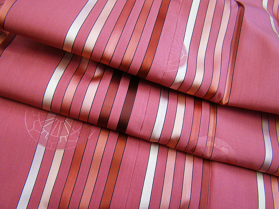 渋いつつじ色地に灰色、灰梅色、小豆色等の縞柄。